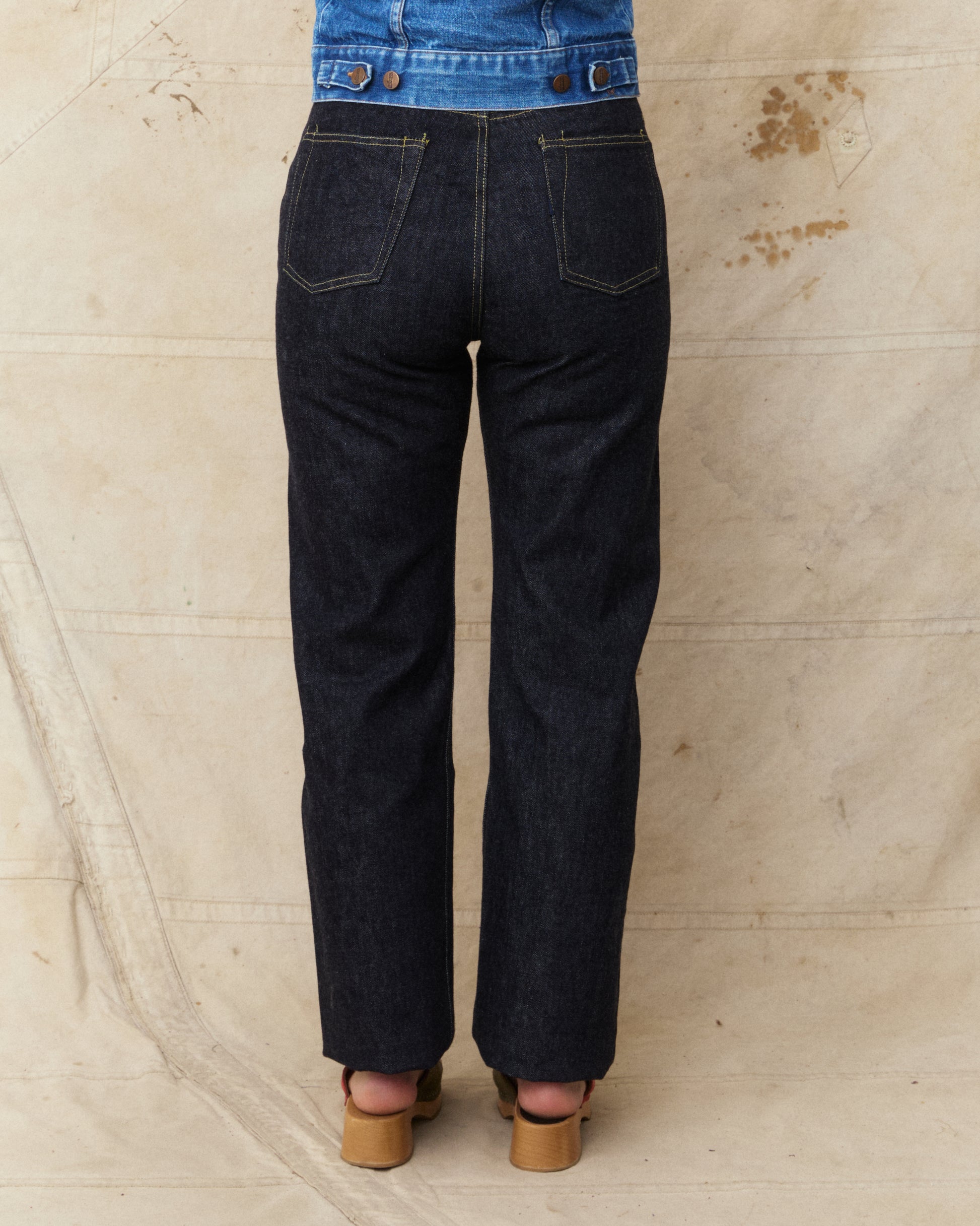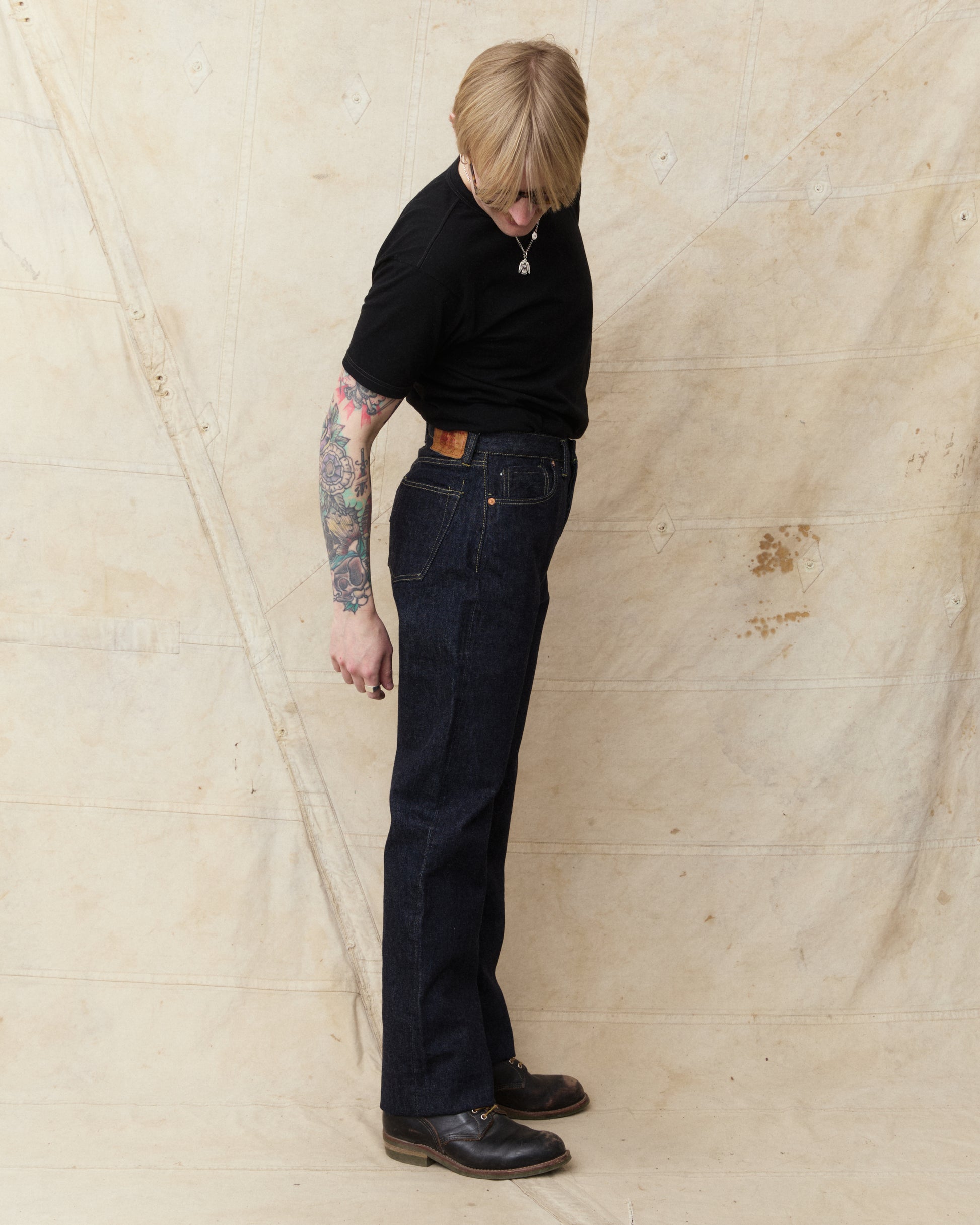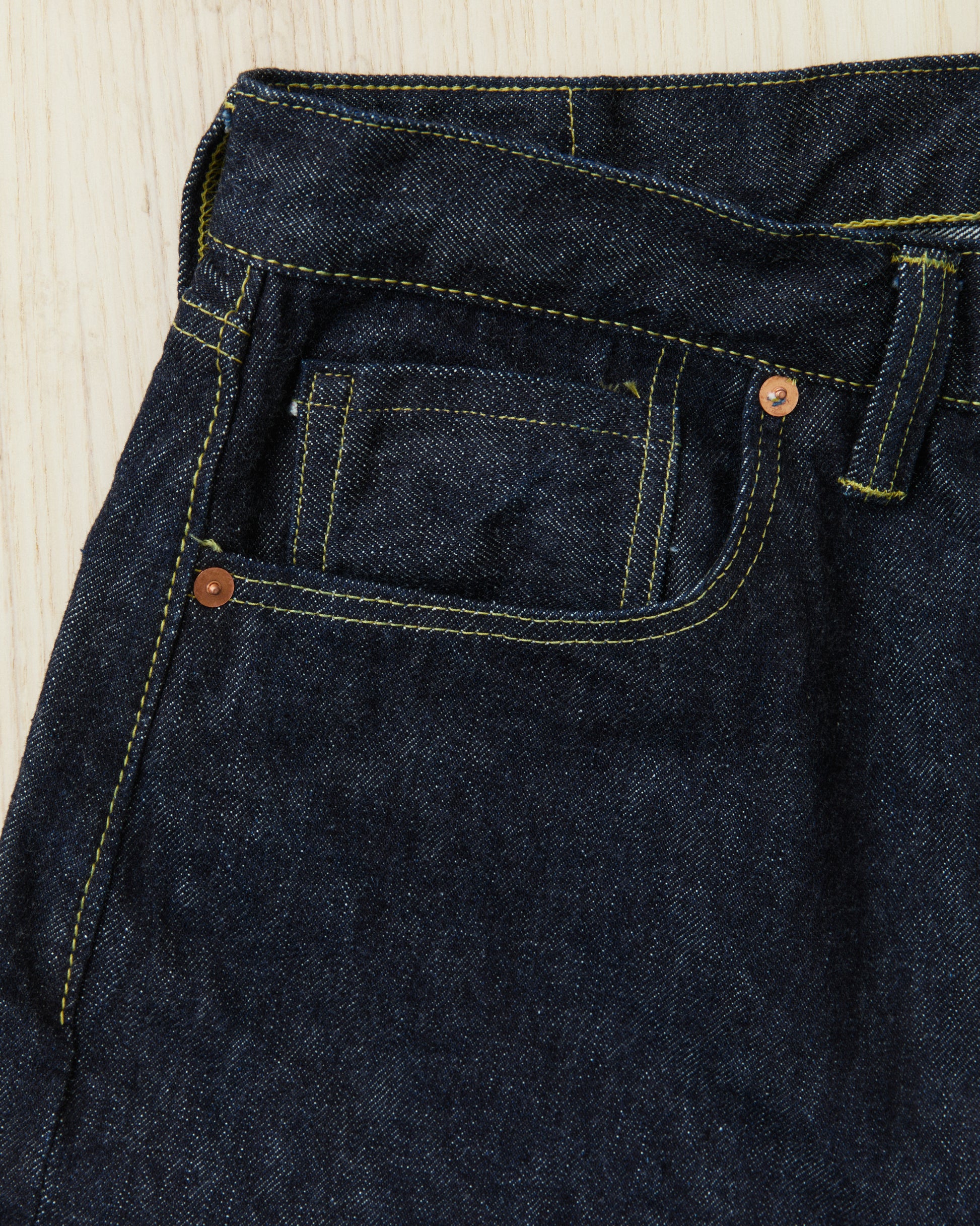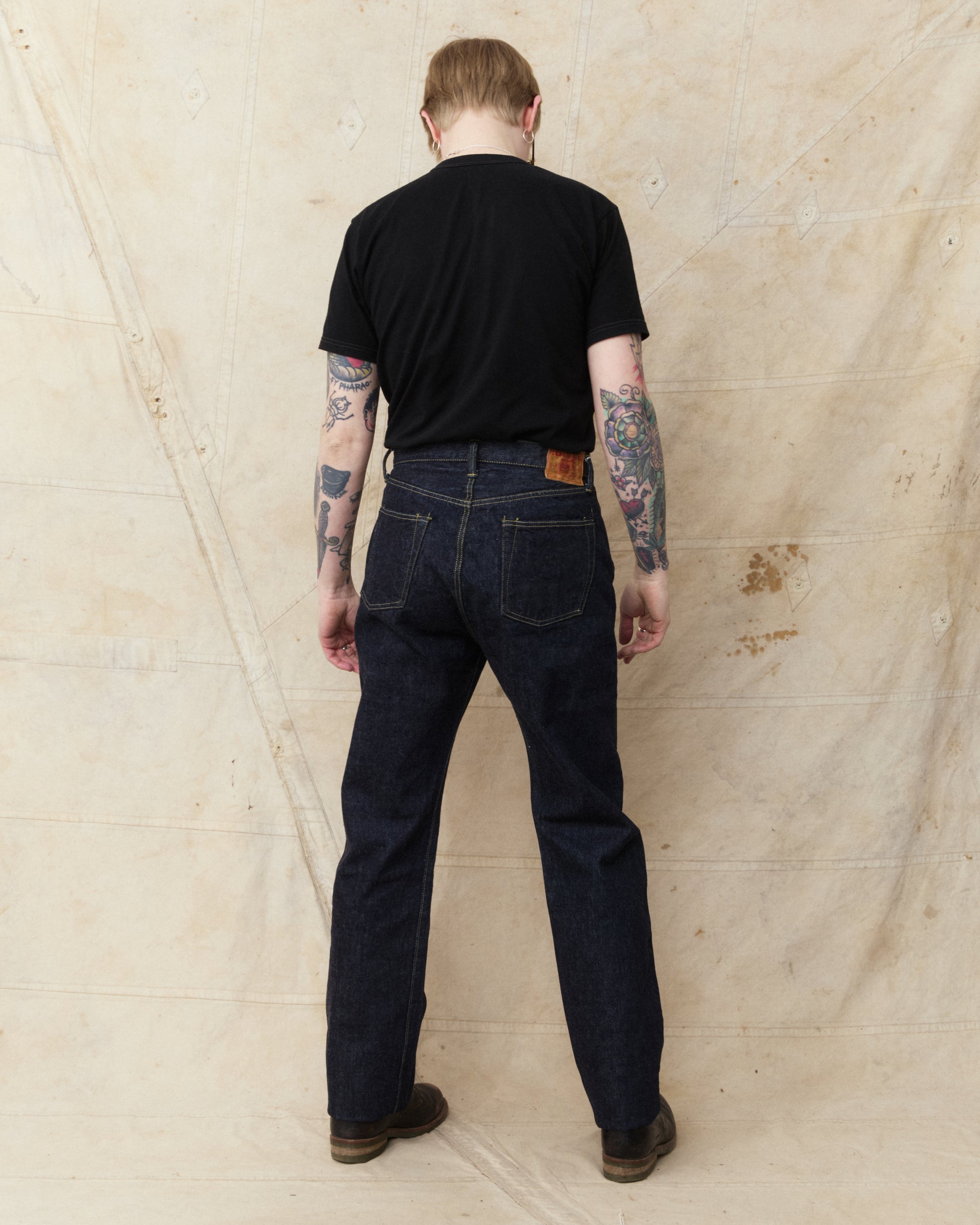 This pair of jeans are inspired by the war time jeans, the S501XX model made by Levi's in the 40s. The war's need for materials led to restrictions on what could be used for manufacturing, which led to a cleaner and simpler design on the jeans from this time. It is made with details such as hidden back pocket rivets and the so called V-stitch behind the top button. The japanese selvage fabric used in this garment is loomed to be as close to the fabrics specs from that time as possible.