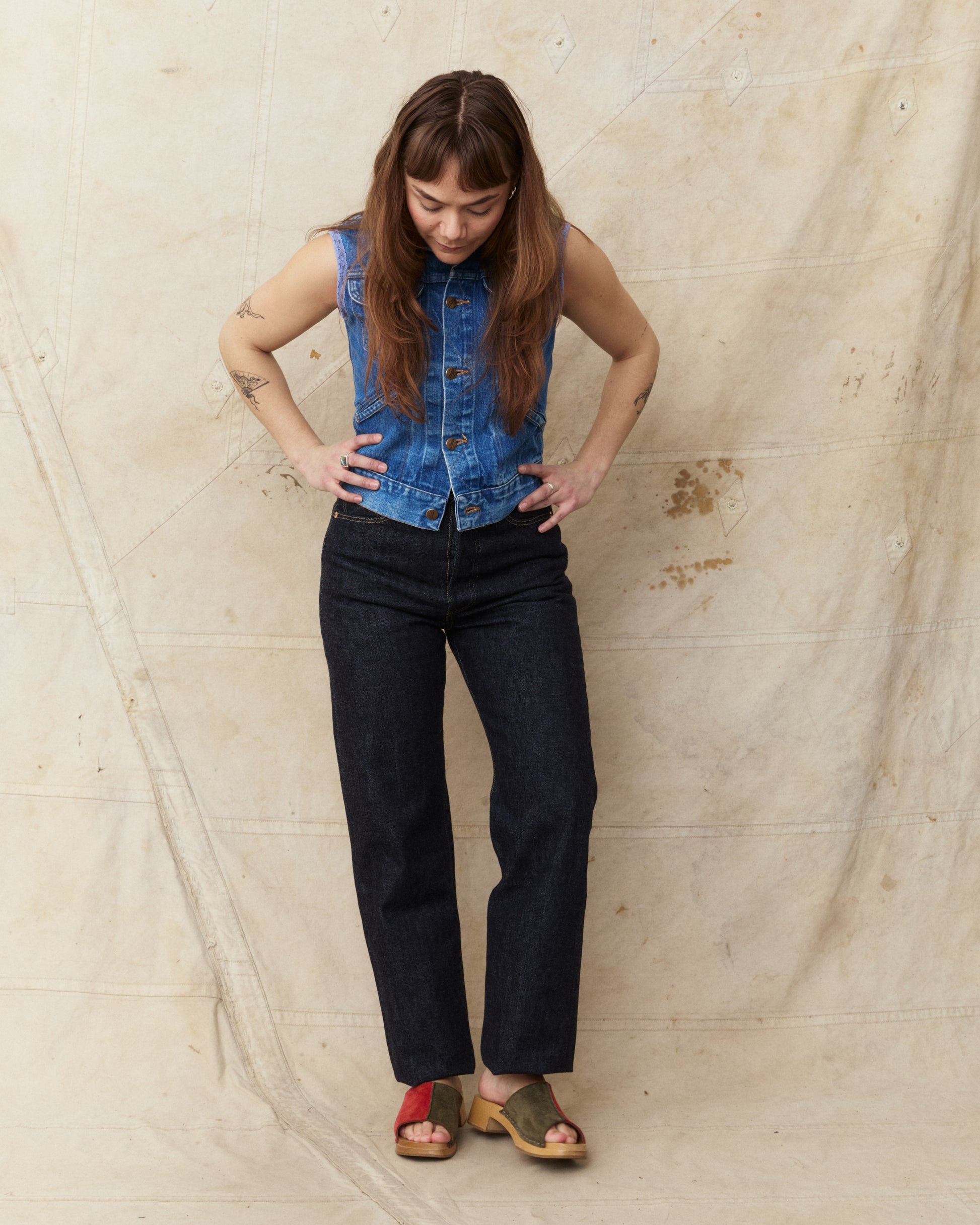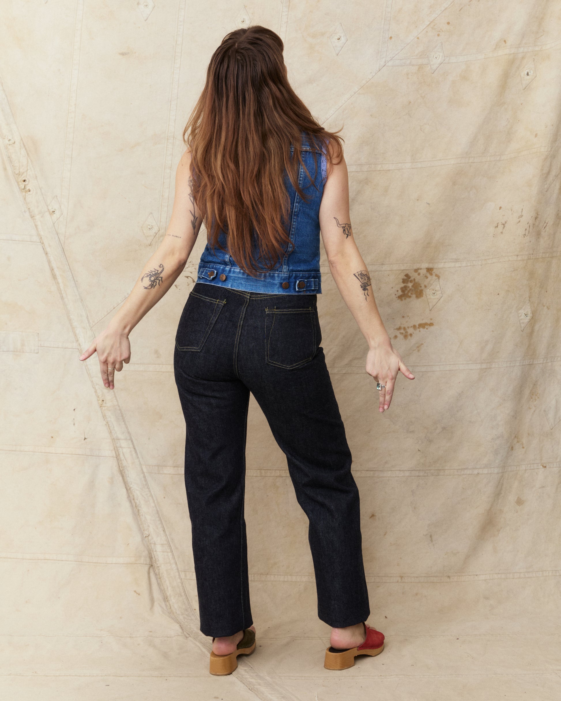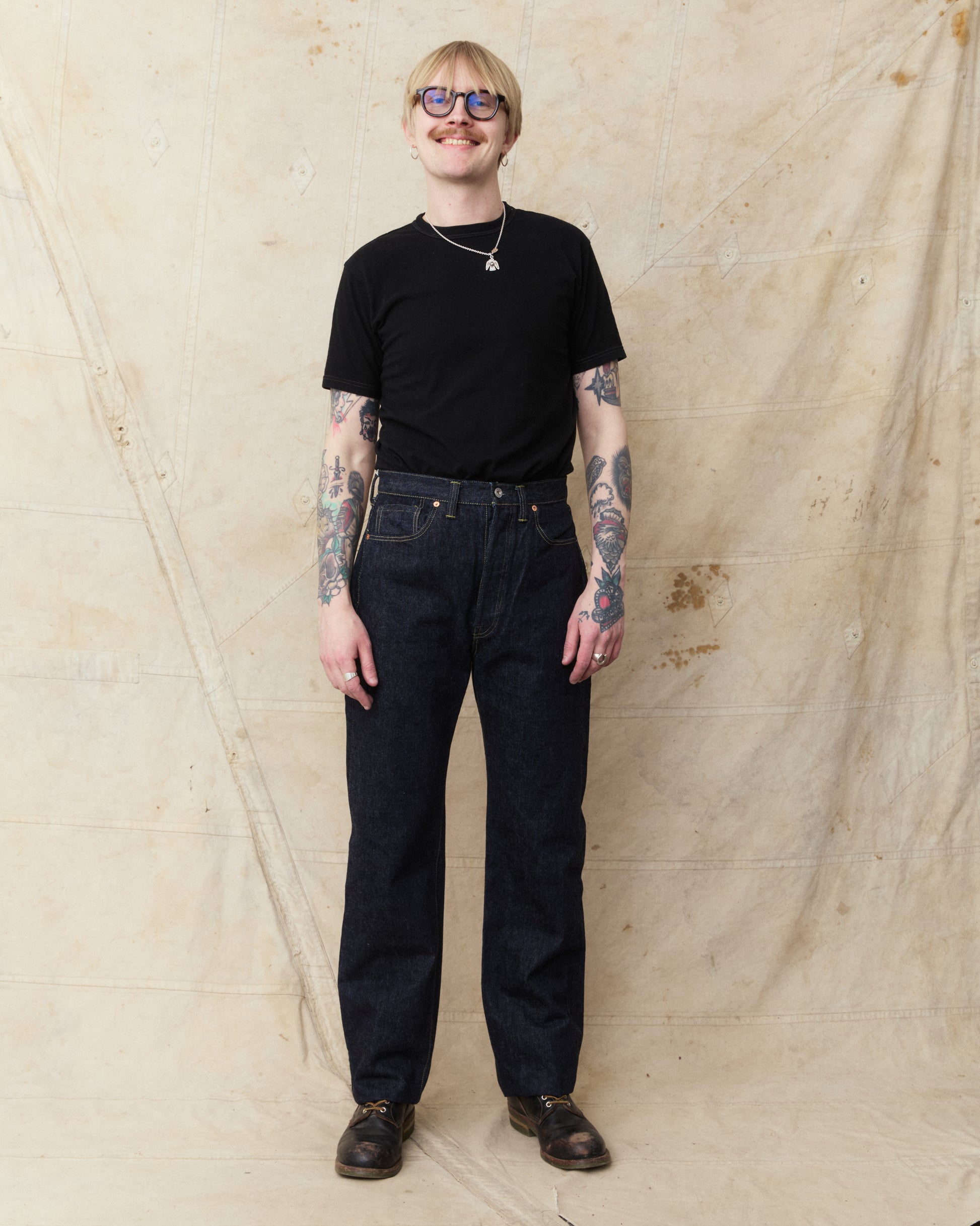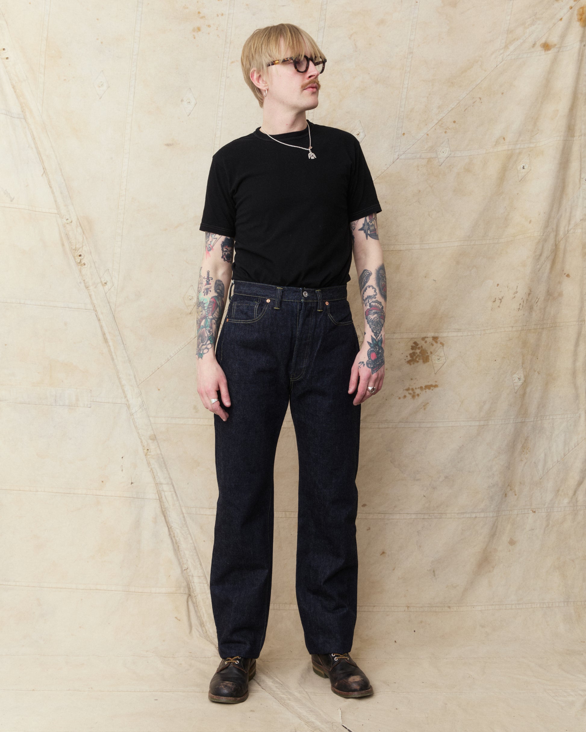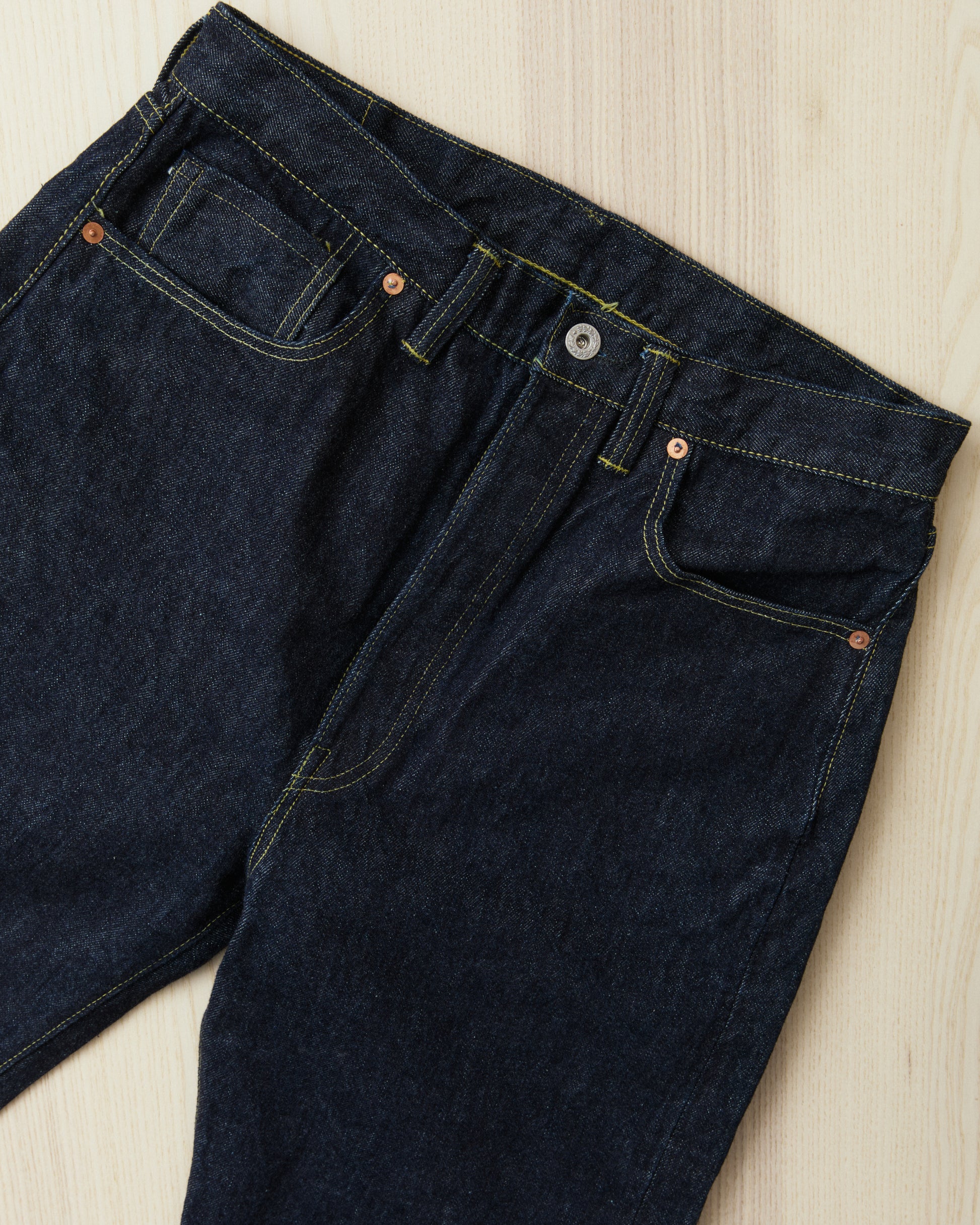 This pair of jeans are inspired by the war time jeans, the S501XX model made by Levi's in the 40s. The war's need for materials led to restrictions on what could be used for manufacturing, which led to a cleaner and simpler design on the jeans from this time. It is made with details such as hidden back pocket rivets and the so called V-stitch behind the top button. The japanese selvage fabric used in this garment is loomed to be as close to the fabrics specs from that time as possible.