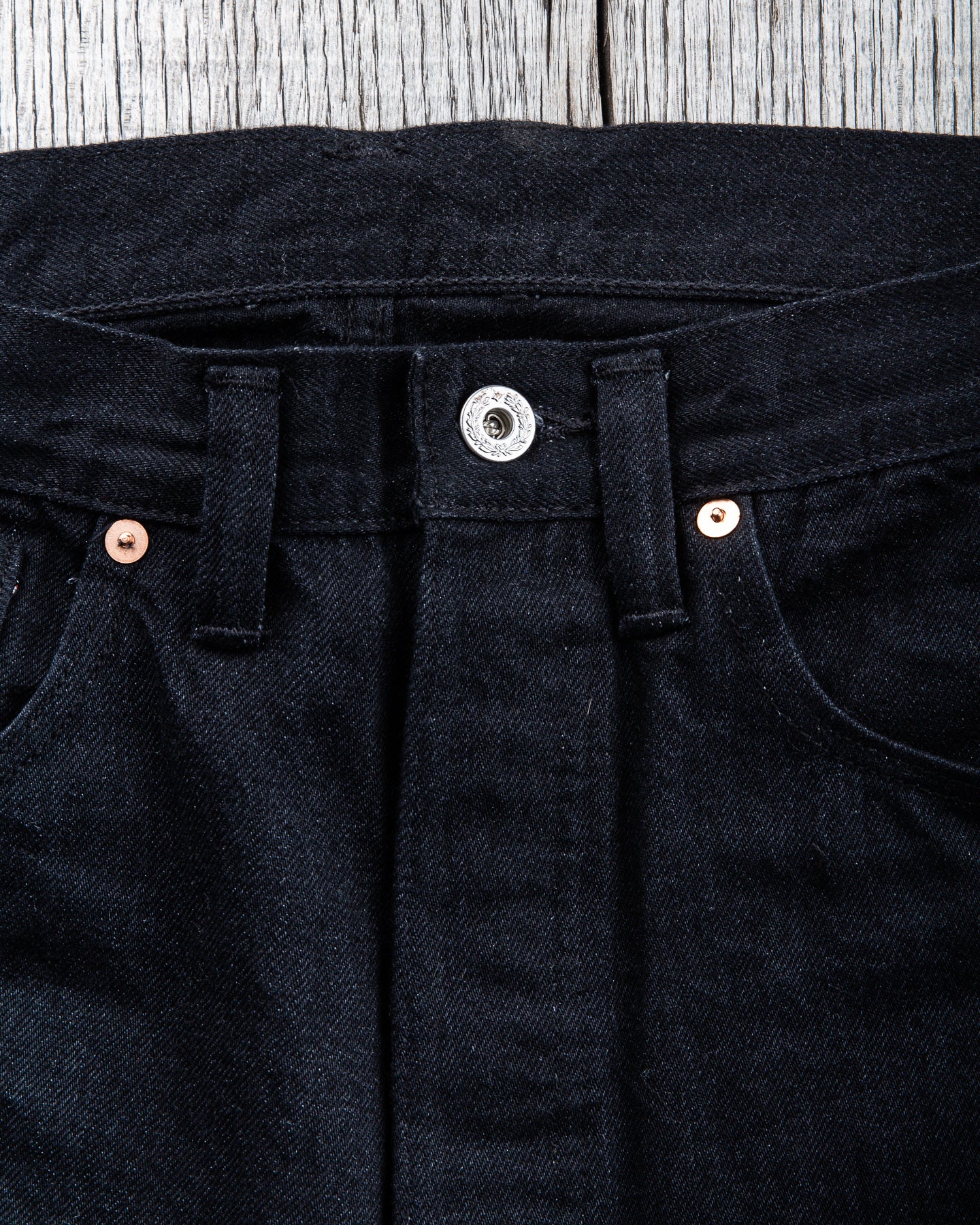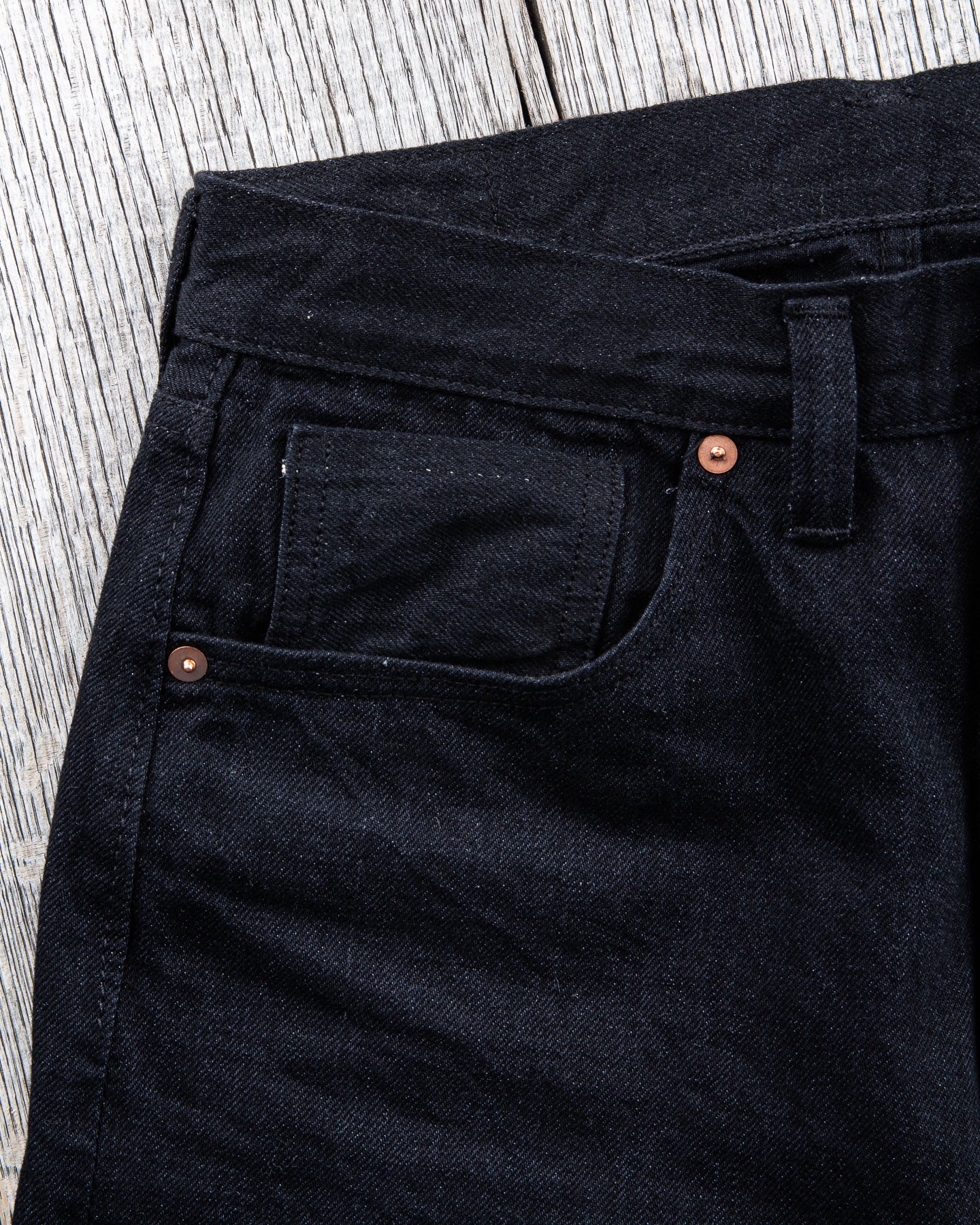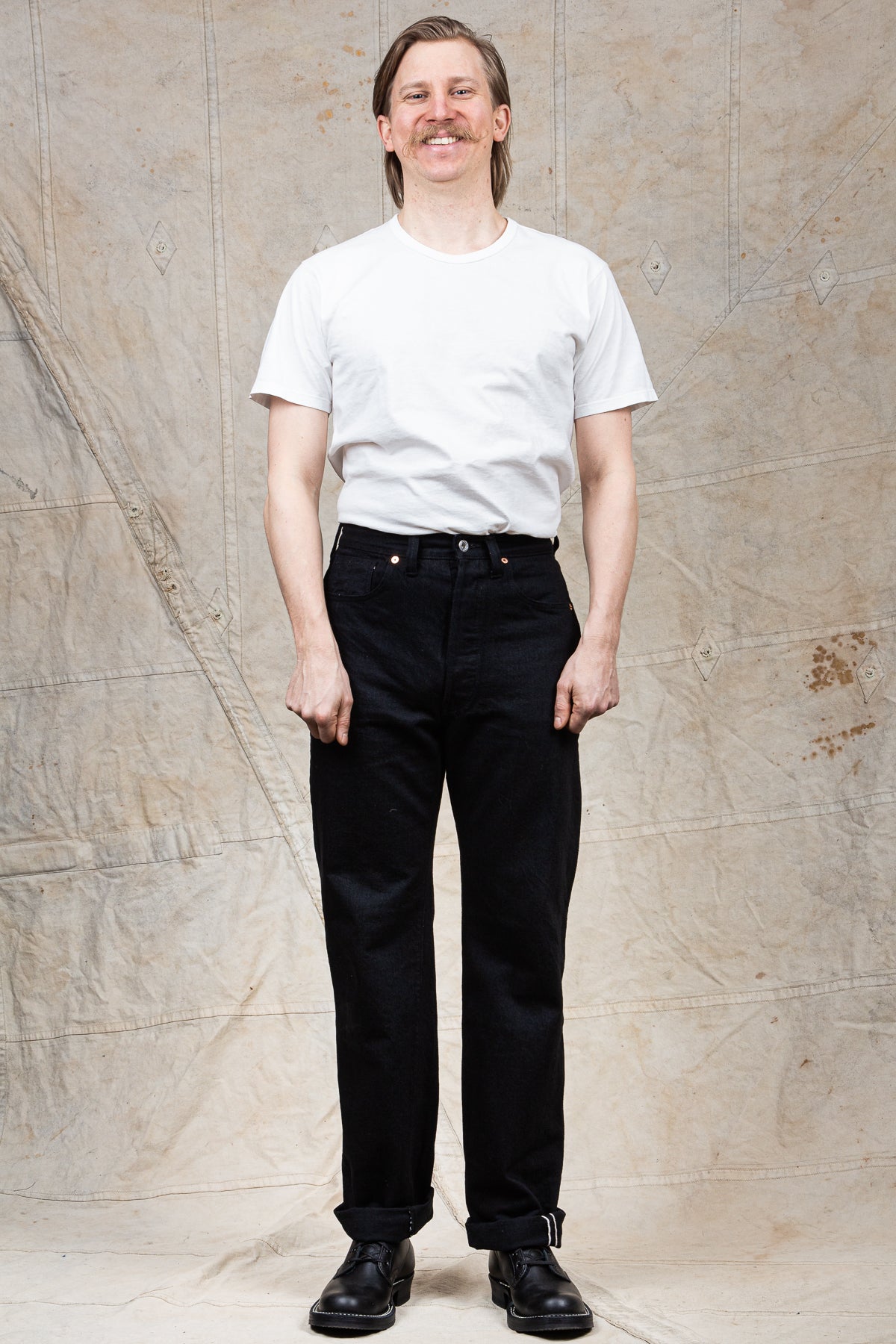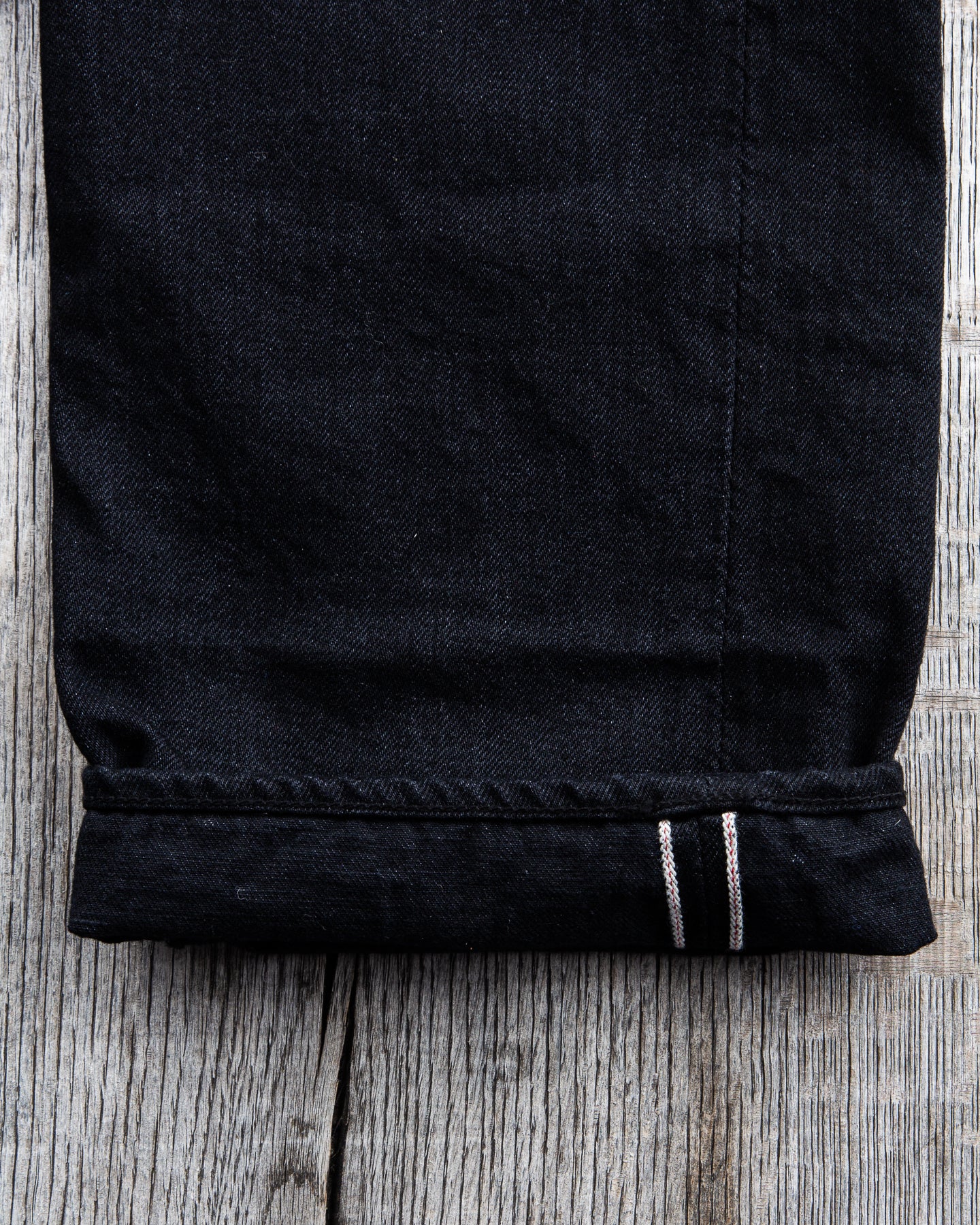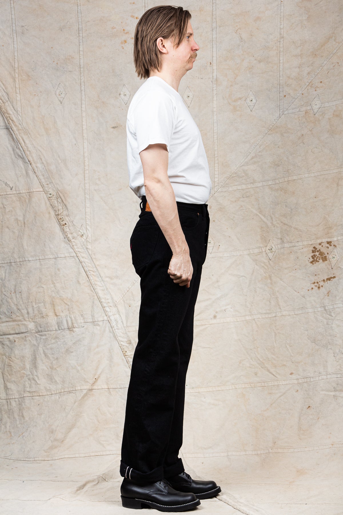 This pair of jeans are inspired by the war time jeans, the S501XX model made by Levi's in the 40s. The war's need for materials led to restrictions on what could be used for manufacturing, which led to a cleaner and simpler design on the jeans from this time. It is made with details such as hidden back pocket rivets and the so called V-stitch behind the top button. The Japanese selvage fabric used in this garment is loomed to be as close to the fabrics specs from that time as possible.