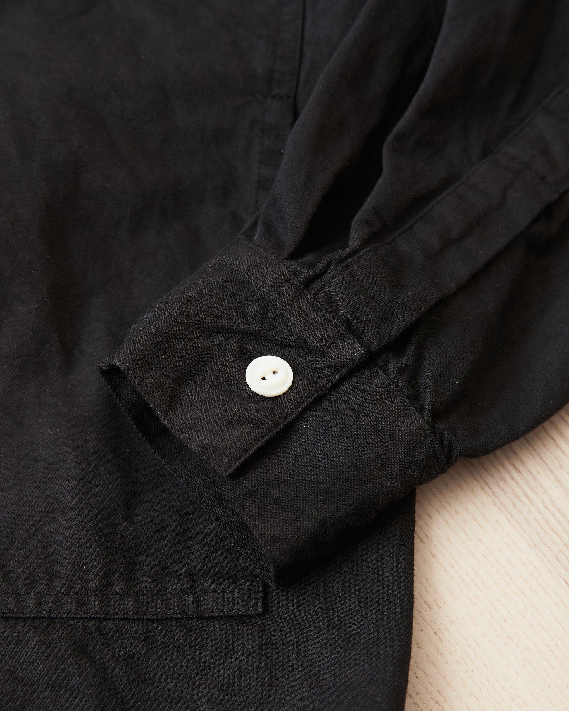 The shirt is cut on the Tender Butterfly block, with no side seams and reversed sleeves, joined along the top sleeve and into the shoulder. Unlike previous butterfly shirts, cuffs open with full tailored plackets behind the wrist.