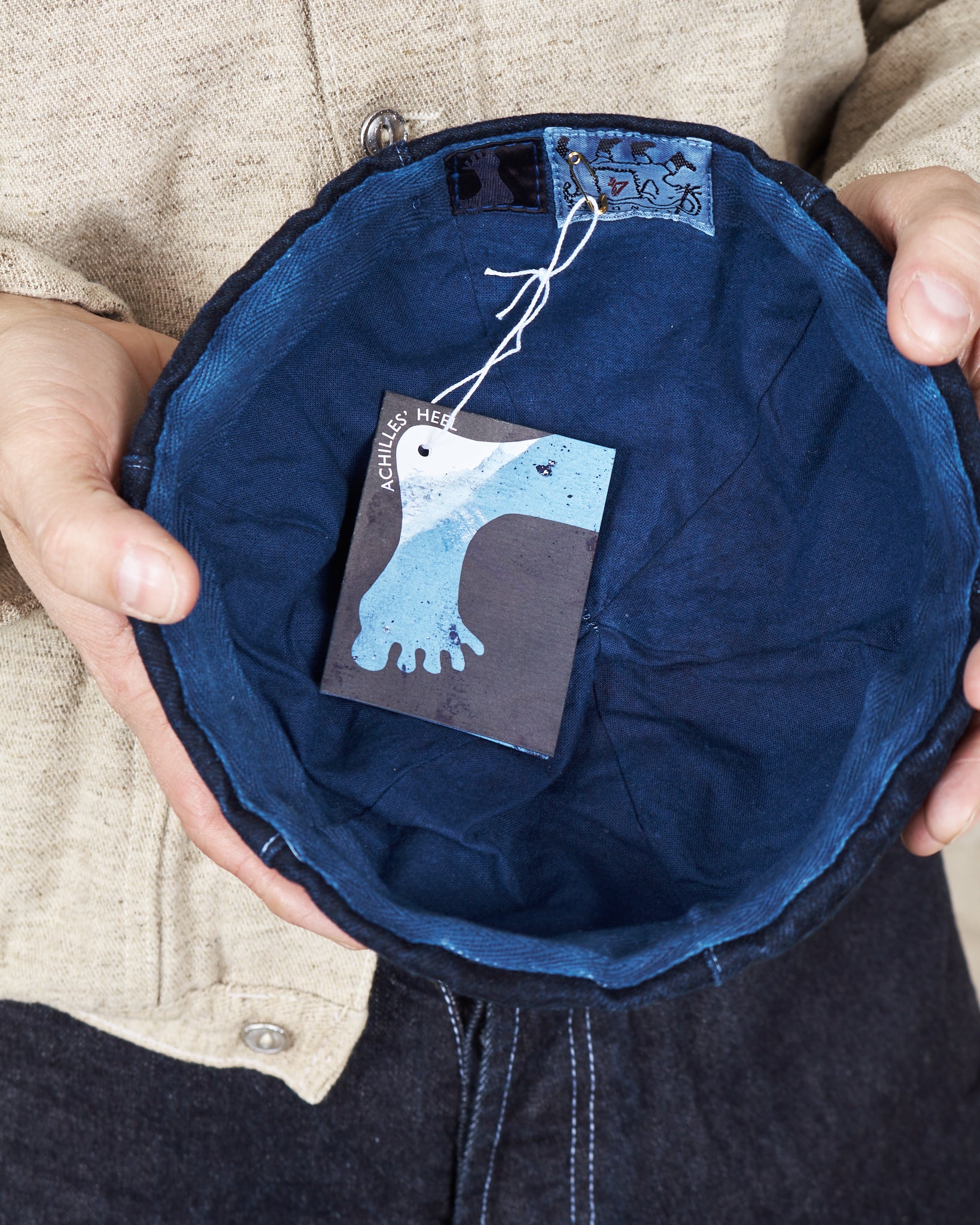 Achilles' Heel Indigo Dyed. In Ancient Greek myth, the goddess Thetis dipped her baby Achilles into the waters of the magical river Styx, which divided the worlds of the living and the dead, to make him invulnerable. Achilles grew up to be a great warrior who was protected in battle by the magic of the water. He was eventually killed by Paris who shot him in the heel with an arrow. The heel was the place where his mother had gripped him as a baby, and was the only part not to be touched by the water. Achilles’ Heel garments are hand dyed in Kojima by William’s indigo teacher. Each garment is dip dyed in indigo, but a certain part of the garment is gripped tight so that it does not touch the indigo dye, and shows the original fabric underneath, just like Achilles’ Heel.