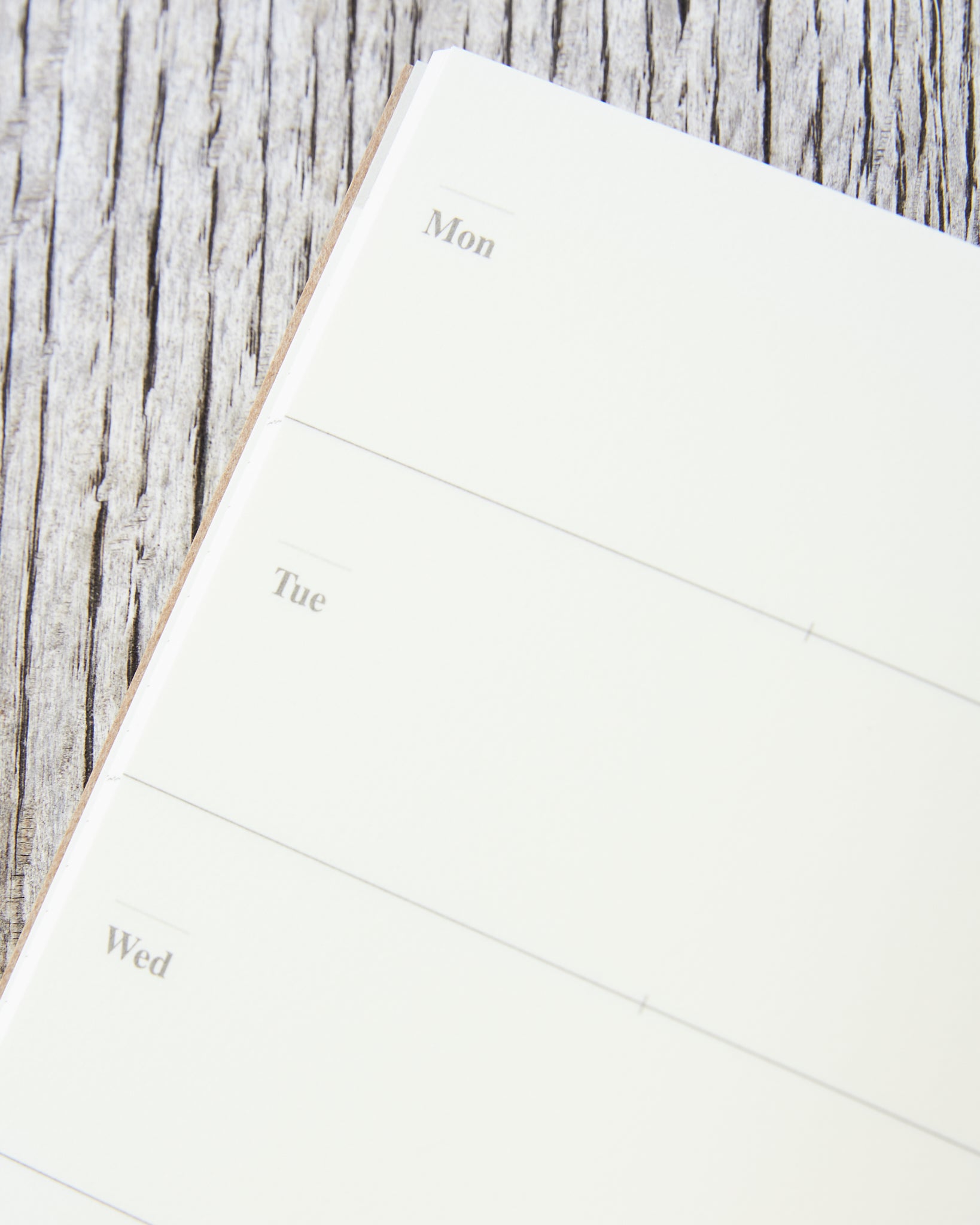 The Traveler's Company #007 Free Diary (Weekly) intended to be inserted in a Traveller's company passport sized Notebook that you will find in our range. The Free diary is named because it has no pre-printed dates. Each spread has a row for each day of the week with a empty space in the lower right corner. this smart diary will last for 28 weeks (6 months) if used as a calendar. Combine two of these with a #021 Regular Notebook Binding Bands and you will cover a whole year!