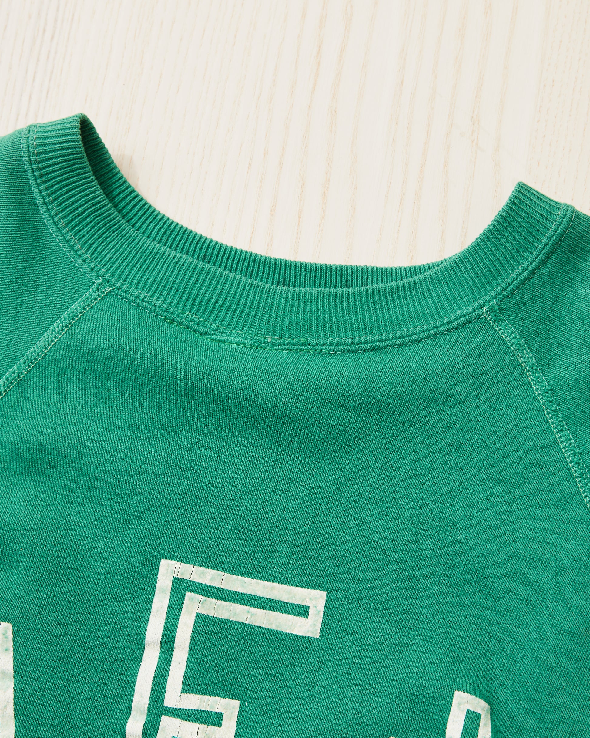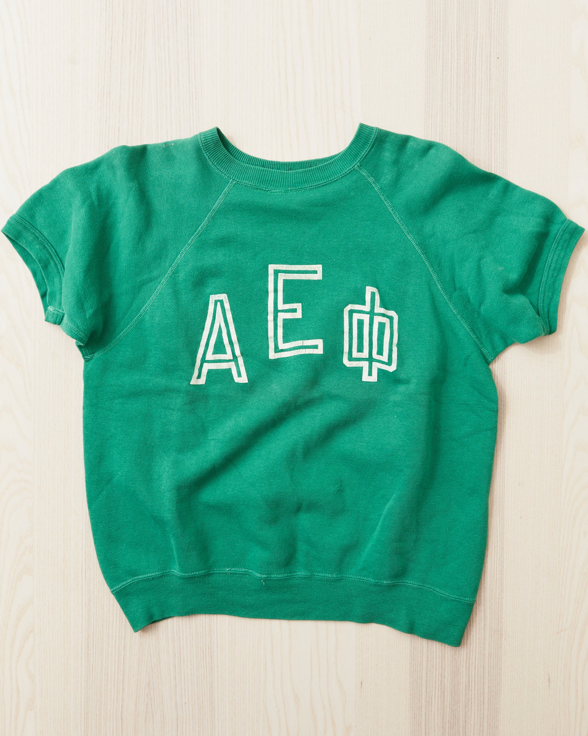Here comes a very old and nice sweater. It is really rare that we get this type of vintage garment in our assortment! This example of a 1950's short sleeved sweatshirt in good condition for its age. If one is into the history of casual American sportswear, then this is a collectors item. The green color is just amazing.