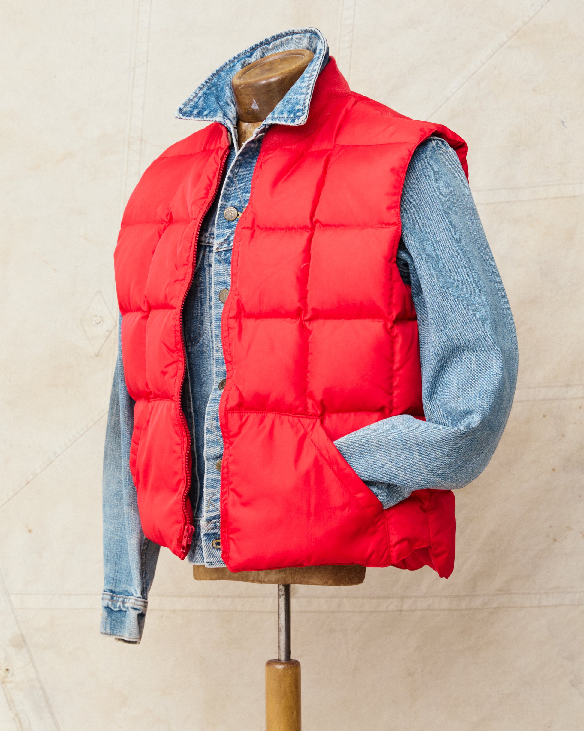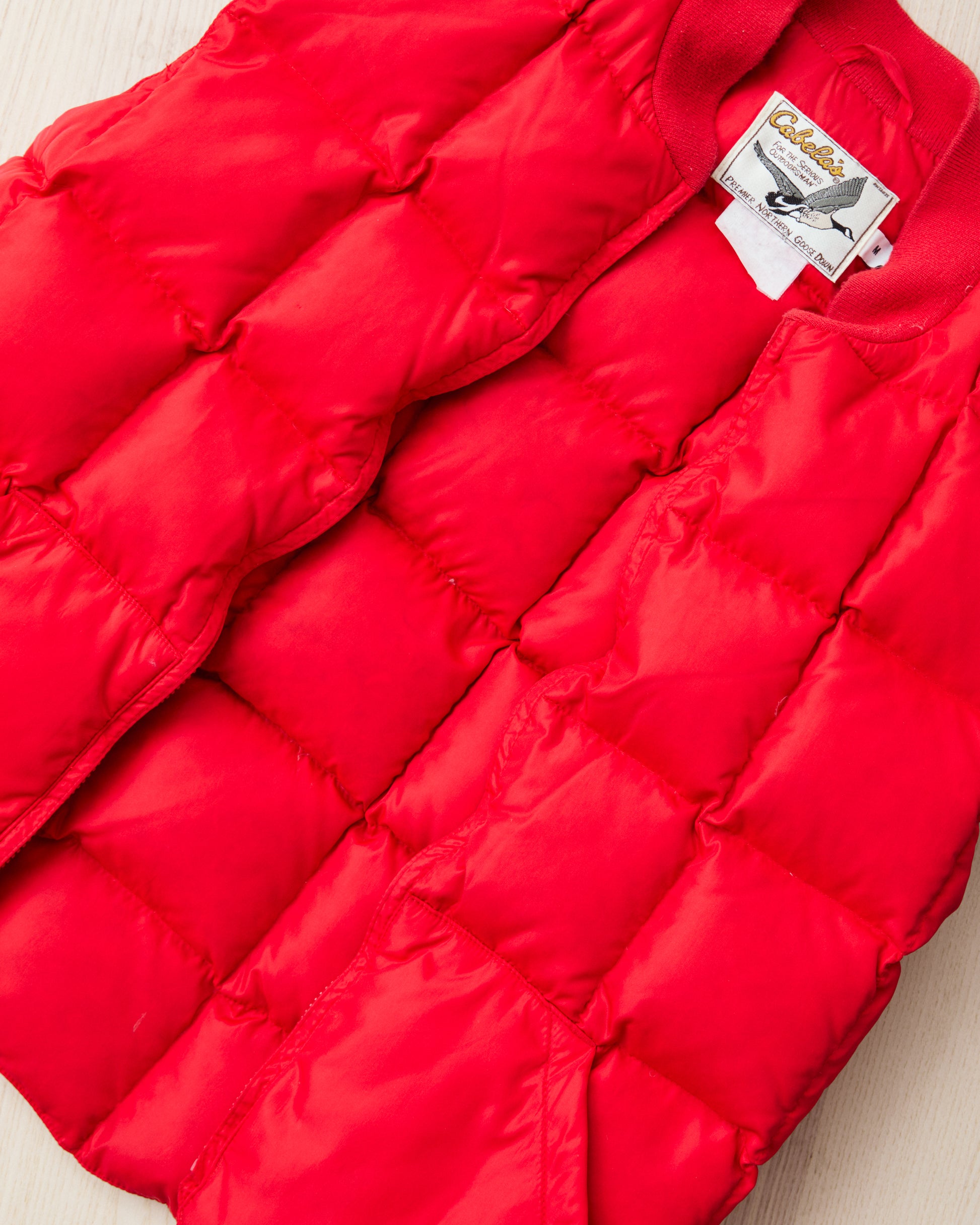 This is a vintage Cabelas down puffer vest with a red nylon shell and liner. It´s in a good vintage condition. It closes with a red plastic zipper and has two lower front pockets. The insulation is 100% down. We say this vest is from late 70's to early 80's.
