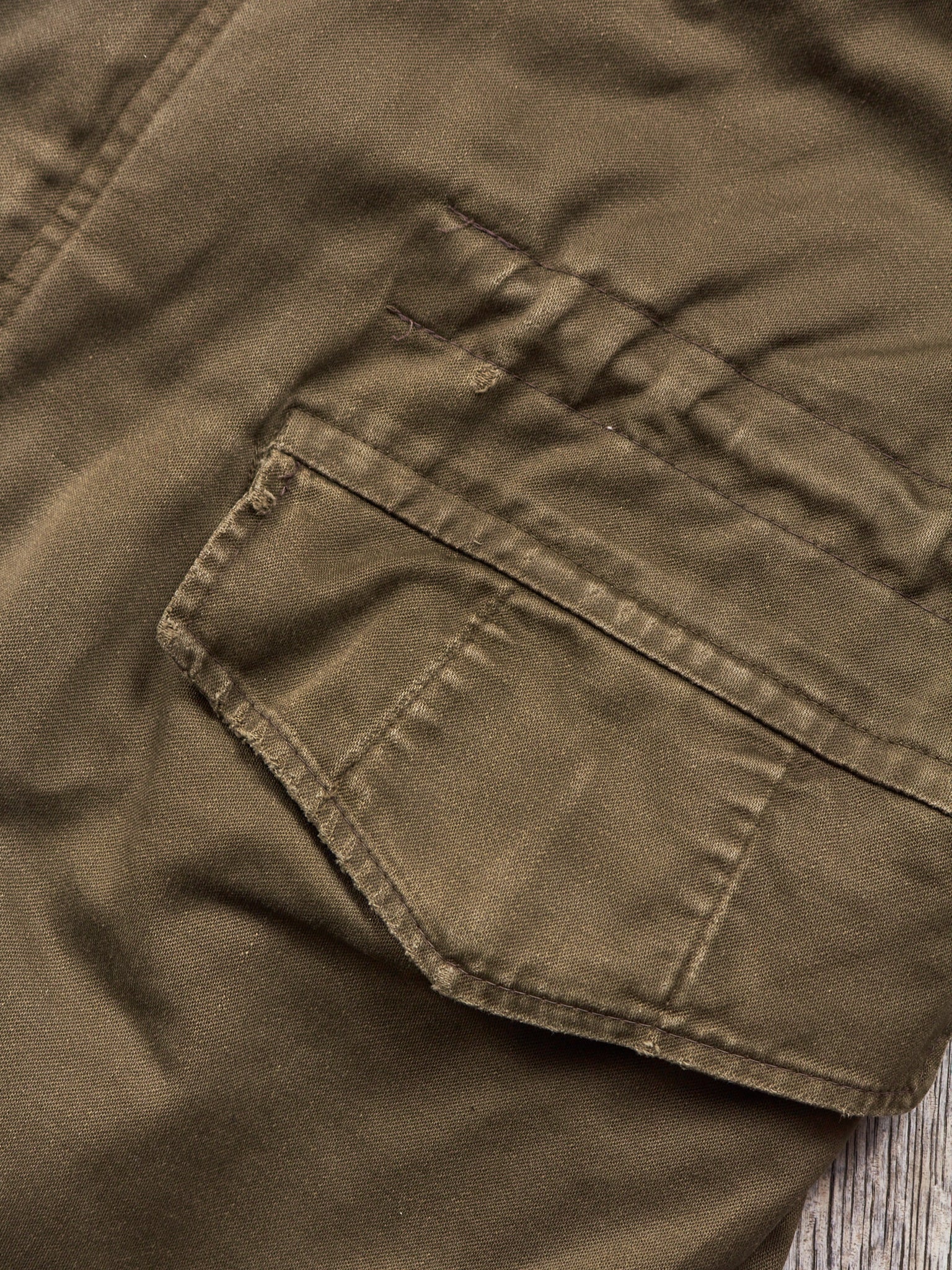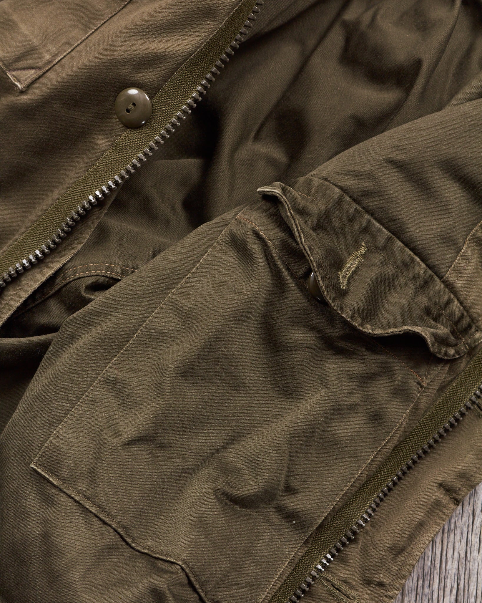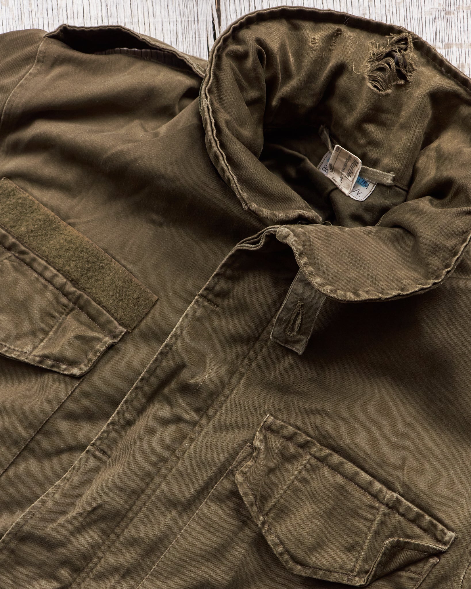 This is a vintage Austrian Army Field Jacket in size M(88 u. 92). It's made out of cotton, has quite a slim/tall fit. The color is a muted army green. This jacket has seen a lot of wear and there is a lot of wear to be seen. Especially a larger hole in the neck area. It comes with a heavy duty YKK zipper that runs smooth and it has a generous amount of pockets.