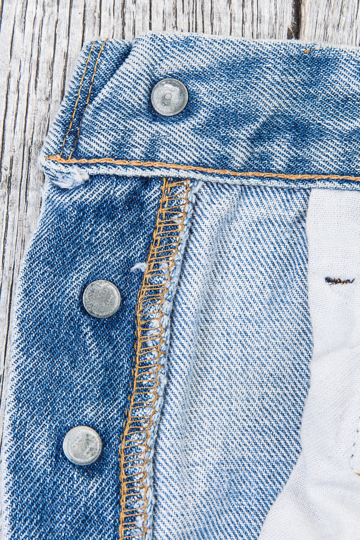 The jeans have been worn a lot and they are faded to a bright blue shade that comes from lots of wear and lots of washes. This is the kind of wear that a lot of pre-distressed jeans tries to replicate today, but in our opinion no fabricated fade can rival a pair of actually worn and faded jeans that have been around for decades. We have repaired the jeans at the crotch because the fabric was a bit thin, and now they are ready to be worn again. We did however leave the hole on the right knee. It can easily be repaired as well but we thought it would be up to the next owner to make a decision about it!