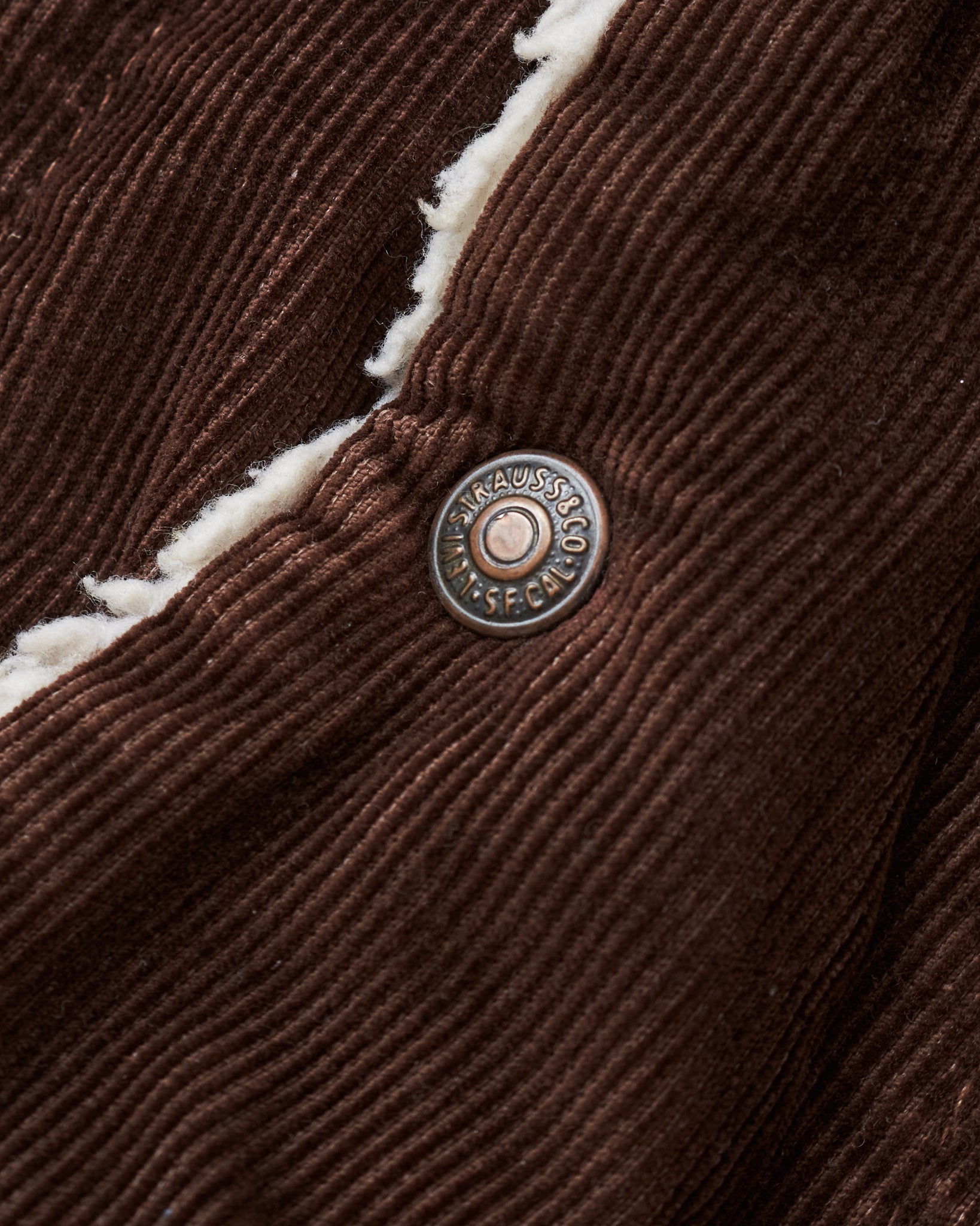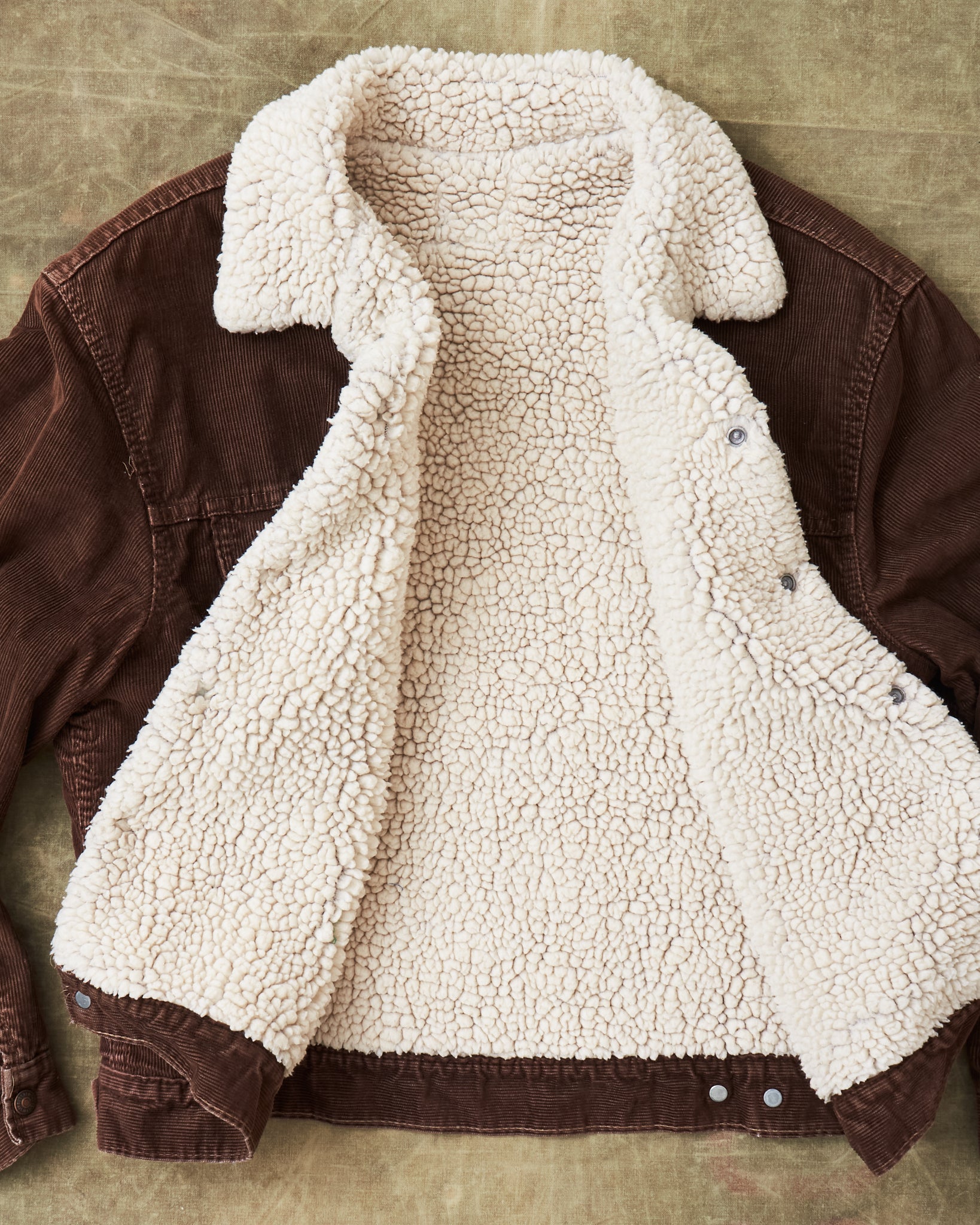 This particular jacket is a vintage one and it has a beautiful, high quality sherpa lining. The outer is made of a semi dark brown corduroy. We estimate this to be from the 70's. It still has the more sleek original version without the lower hand warmer pockets. The condition is good for it´s age, but signs of wear can be found.
