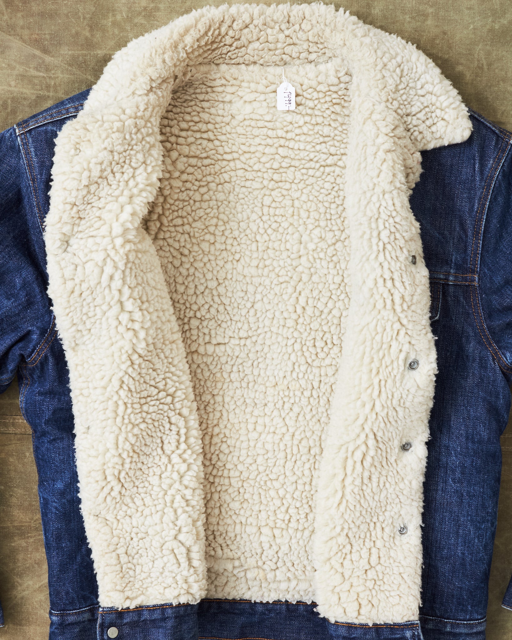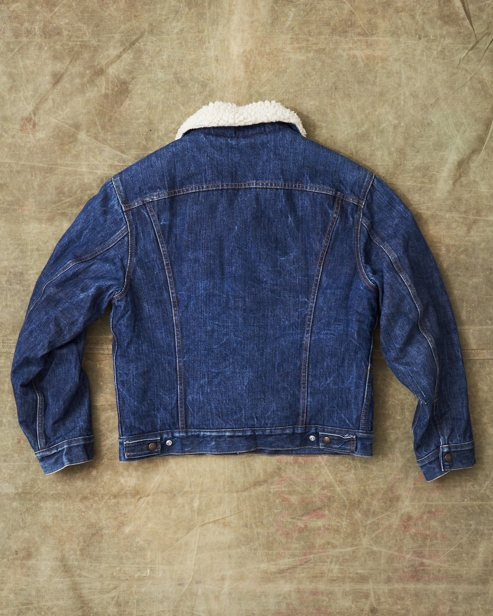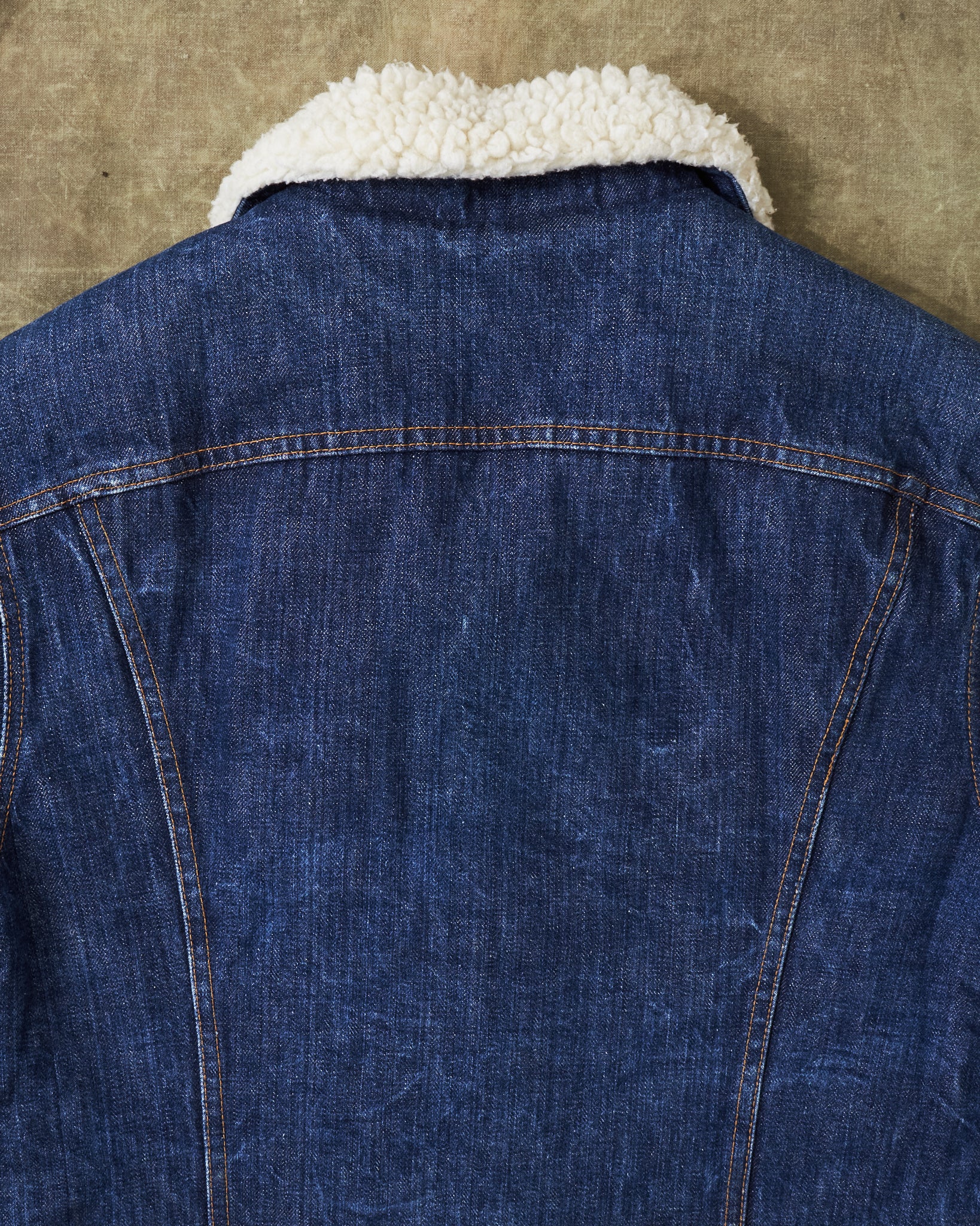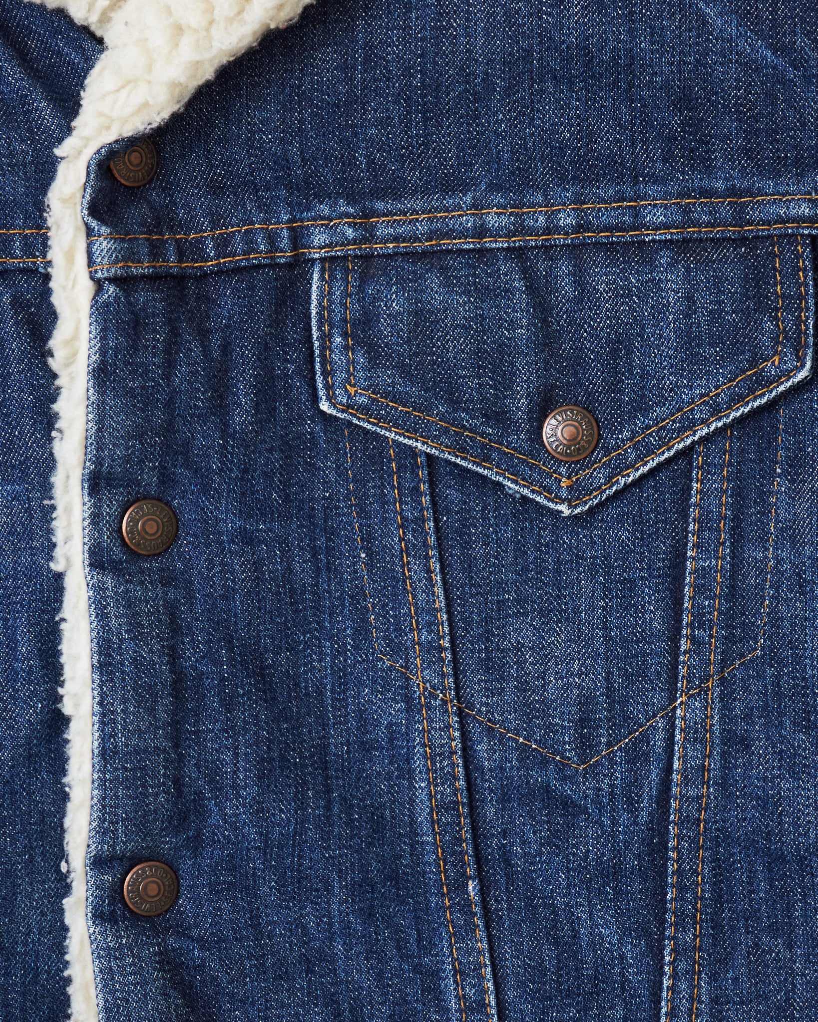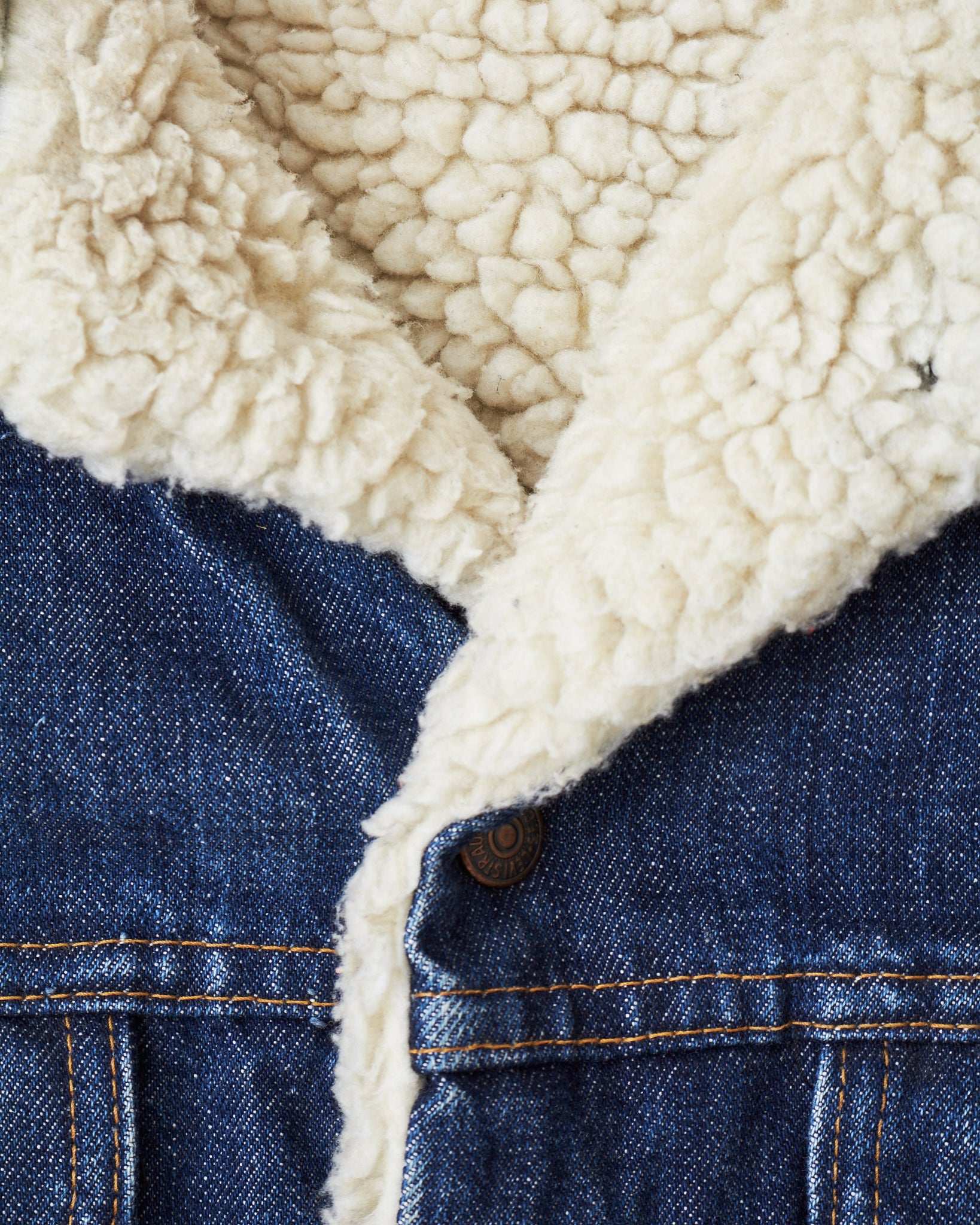 This particular jacket is a vintage one and it has a beautiful, high quality sherpa lining. The outer is made of a beautiful denim. We estimate this to be from the 70's. It still has the more sleek original version without the lower hand warmer pockets. The condition is good for it´s age, but signs of wear can be found.
