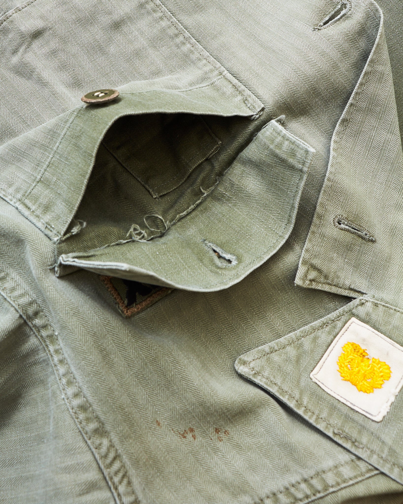 The fabric is a nicely worn cotton herringbone twill, a fabric that got its name because the texture resembles the skeleton of a herring. This weaving technique is most commonly used in wool textiles and for more dressed up suits, but during the 40s and 50s it was also used in the military garments as in this case. The cotton herringbone fabric is referred to as the "HBT twill".