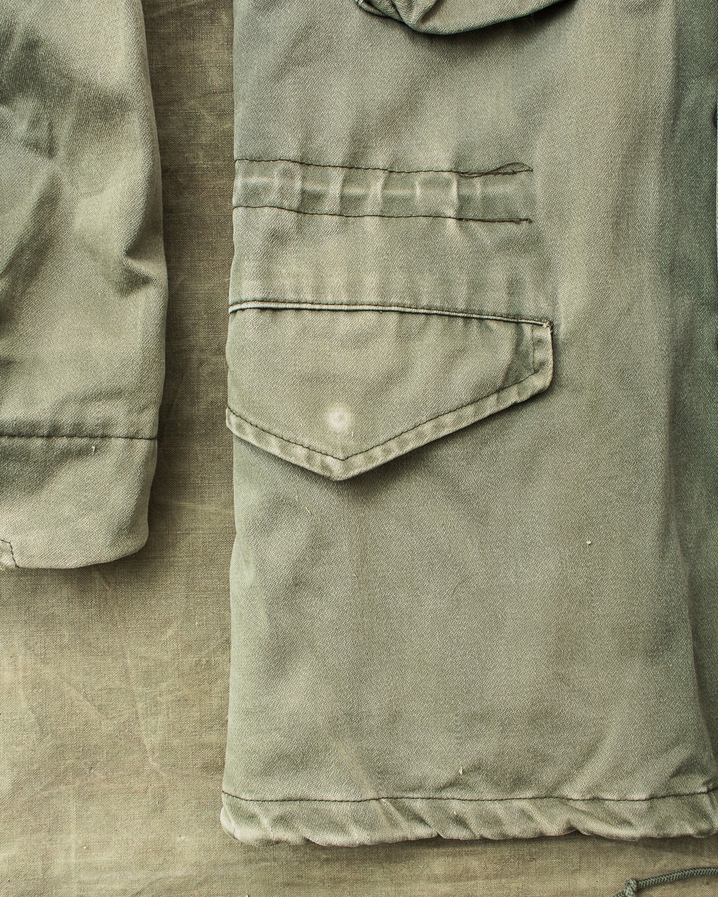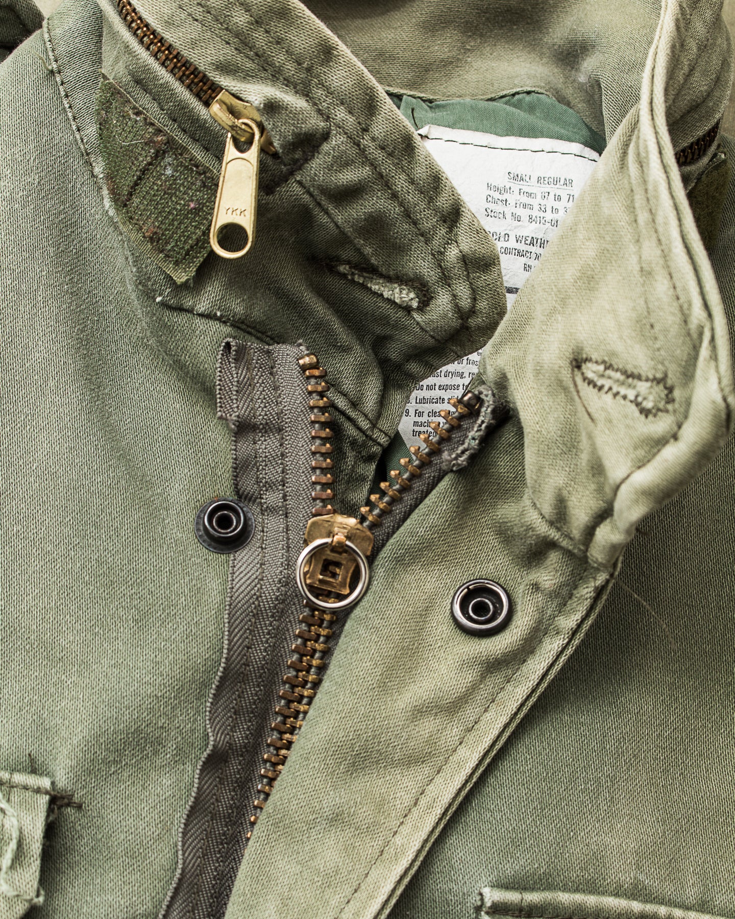 The M-65 Field Jacket was an improvement on the M-51 Field Jacket. With some changes from its predecessor such as the introduction of velcro instead of buttons in the cuffs and at the collar, the M-65 also has a built in hood that's hidden in the collar. The jacket is made in windproof cotton sateen cloth and features four pockets on the front and a drawstring waist, just like the earlier versions of the Field Jacket. The olive drab version remained in service until the early 80s and was then replaced with a woodland pattern camouflage version.