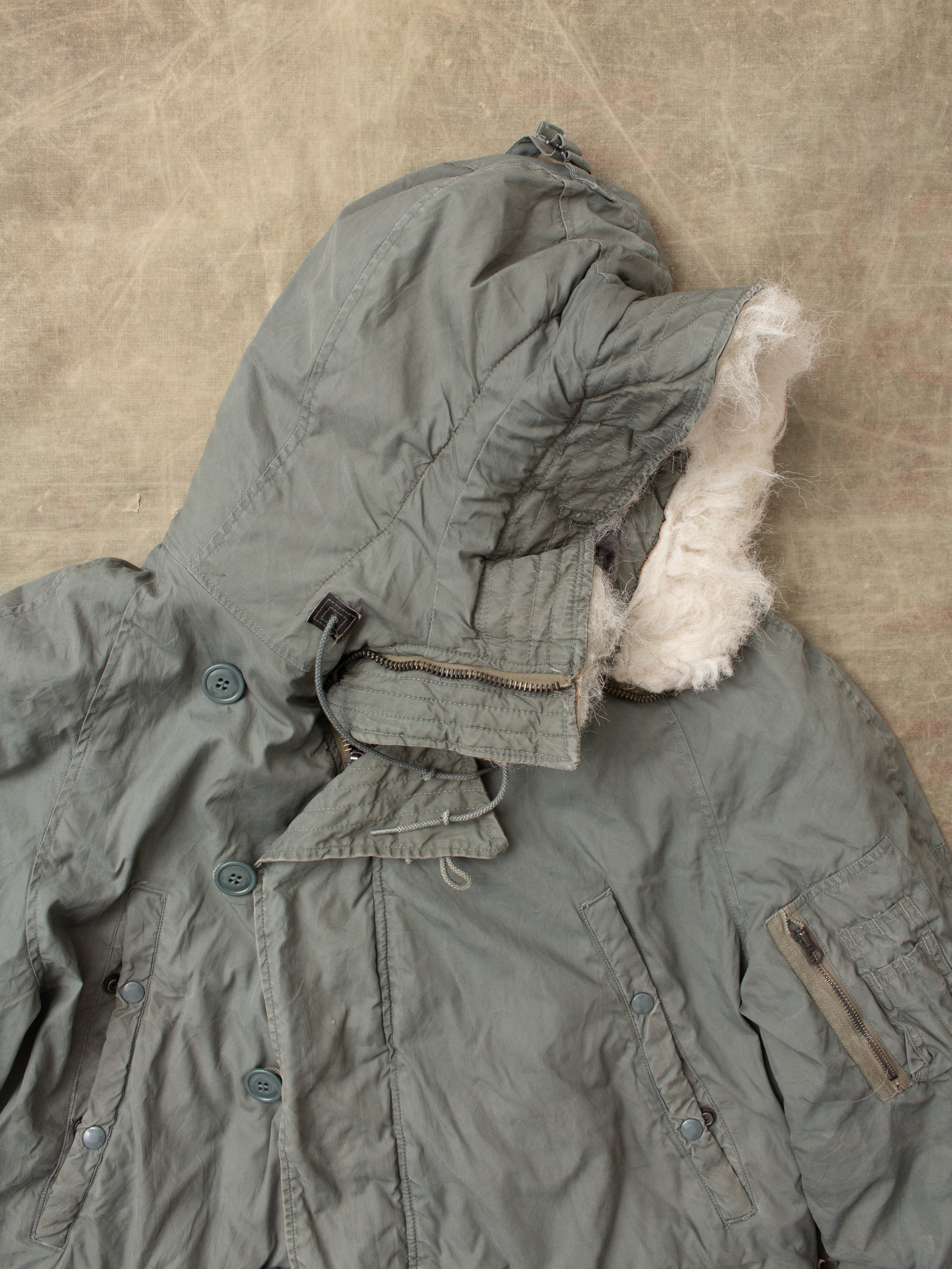 The N3B Parka was issued in the US Airforce in 1958 with the description "for aircrew members in extremely cold environments." The jacket is a 3/4 length parka with four pockets, outer layer of cotton/nylon twill, insulated with and lined with polyester. This garment is also known as the "Snorkel Parka", because the hood can be zipped up leaving only a small opening and the idea is that the exhaled air will heat up the inhaled air slightly as they pass each other in the tube formed by the hood.