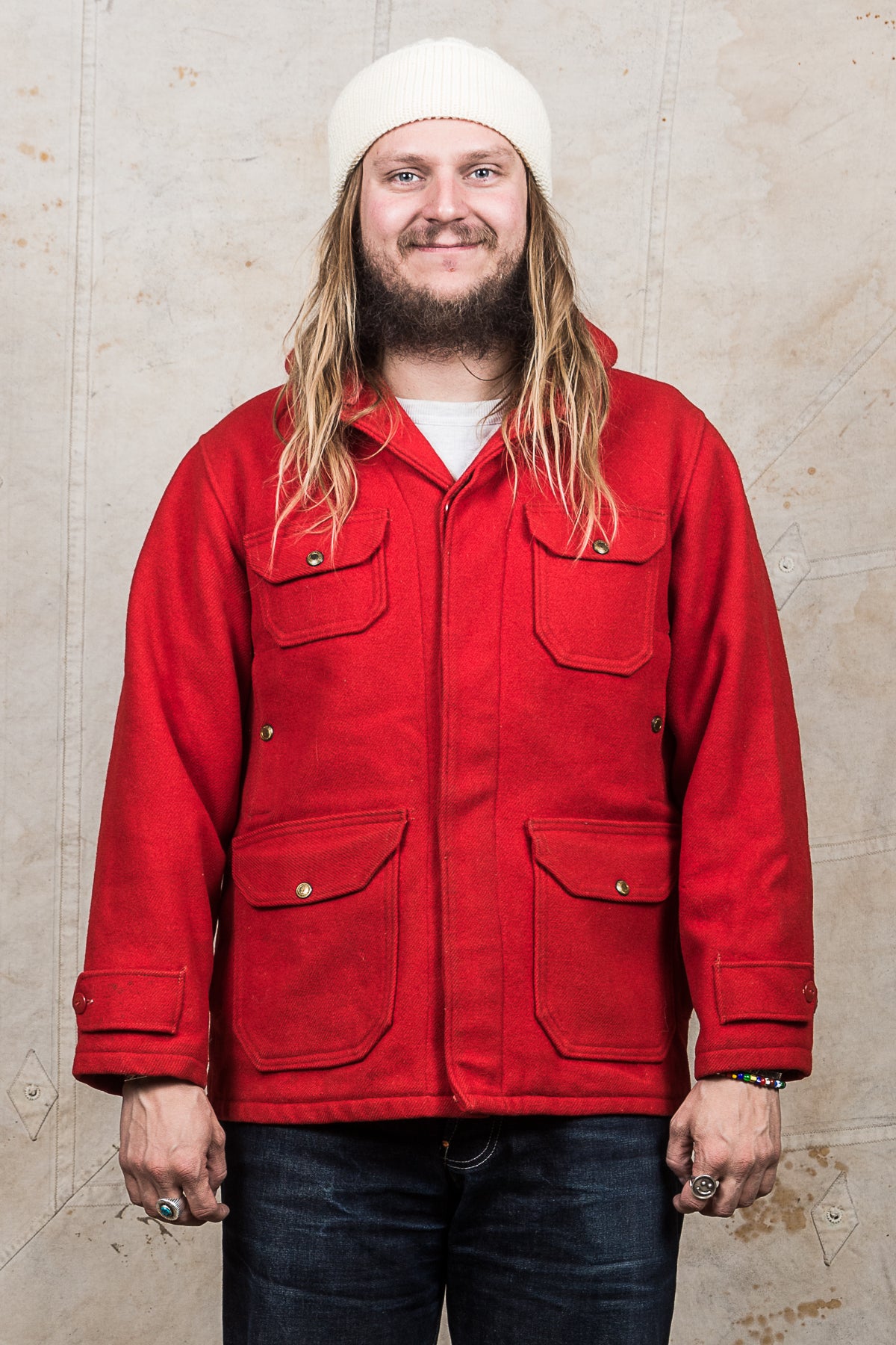This is an original vintage jacket from the middle of the last century and although it has seen many years of use it is in great condition for it age! The jacket was intended to be worn as a hunting jacket and it has plenty of pockets that will come handy when spending time outdoors. It is made of a thick and warm wool fabric and lined with cotton so it will surely keep you warm during winter and the bright red color will also help you to stay visible when worn in the forest or during dark winter evenings.