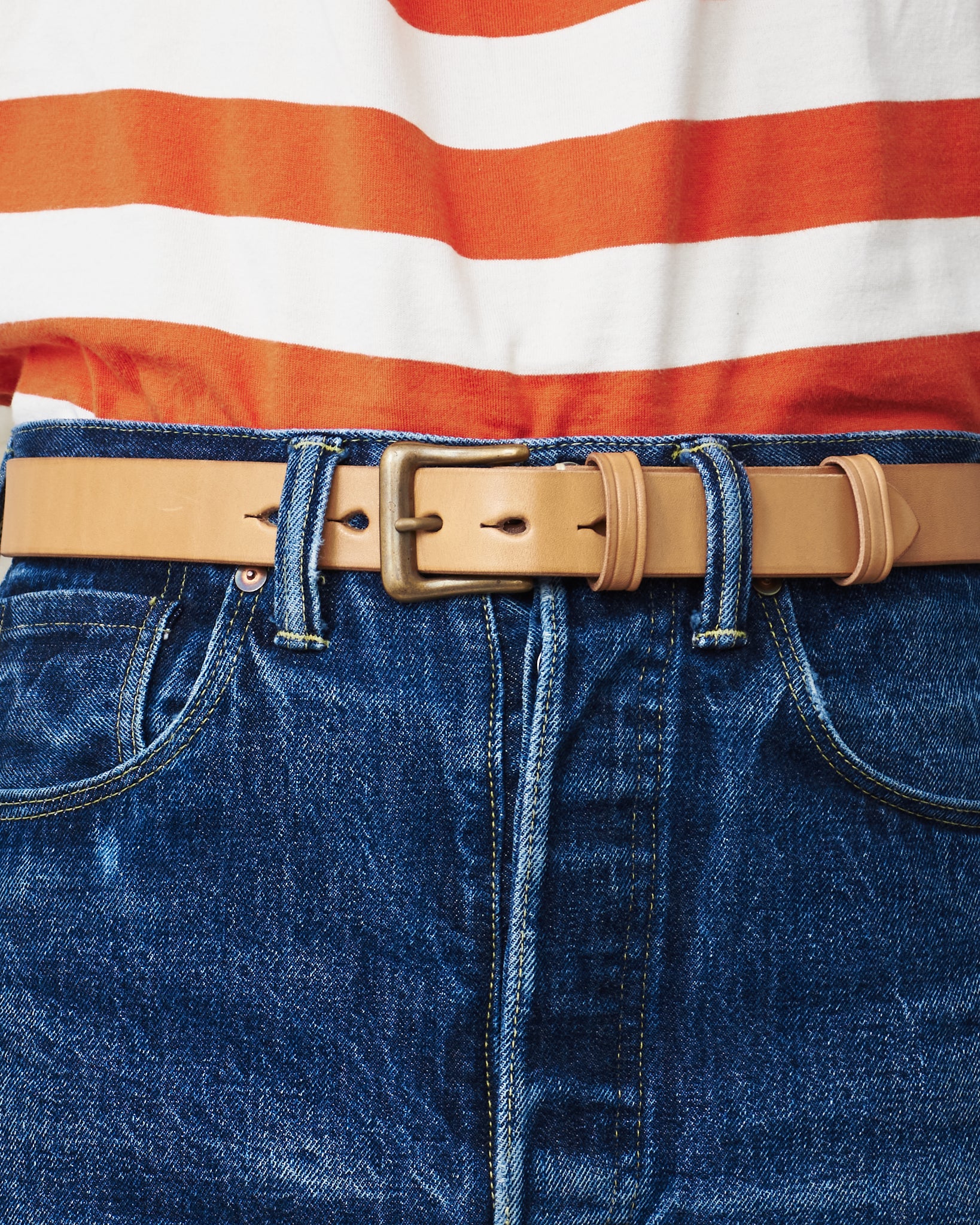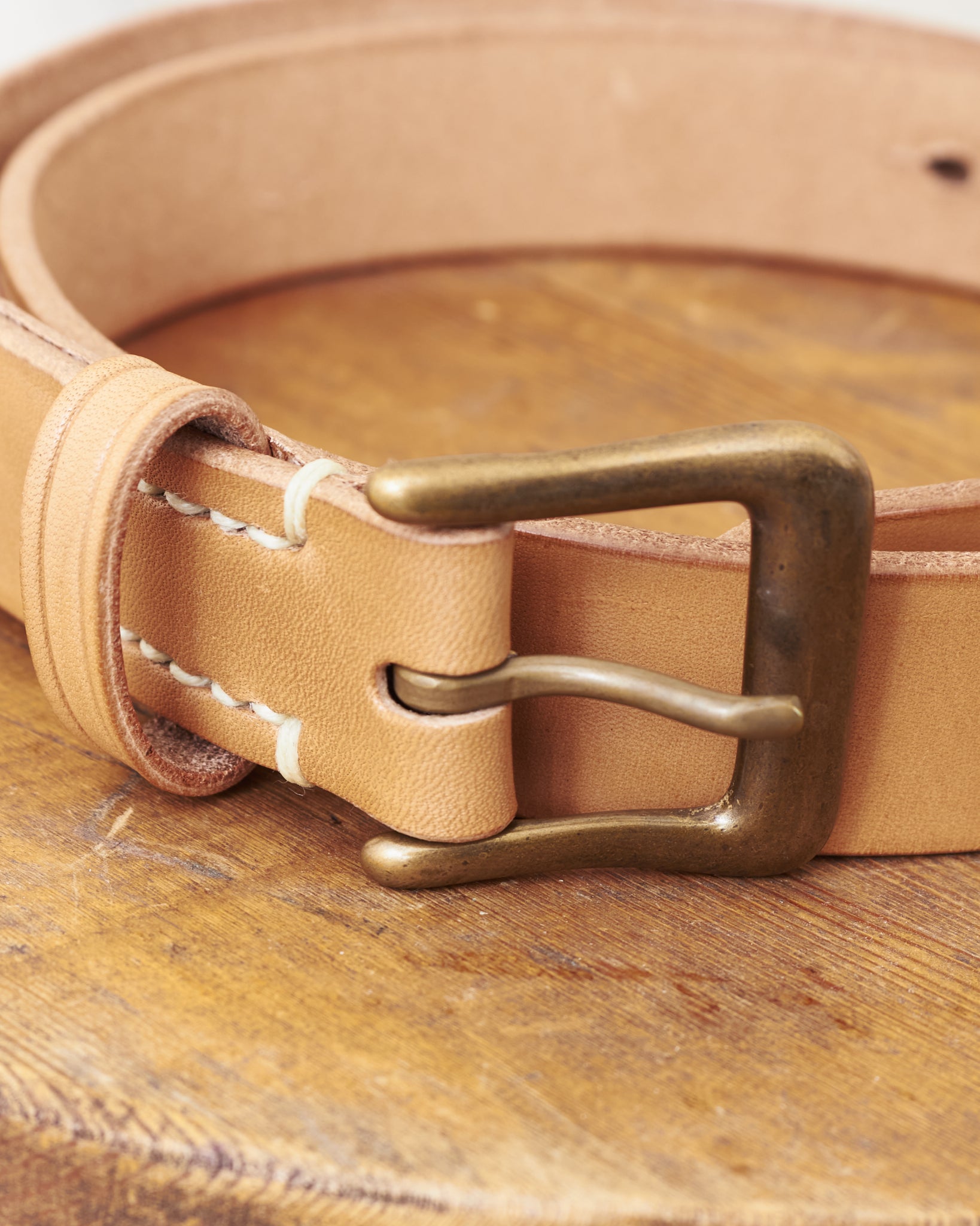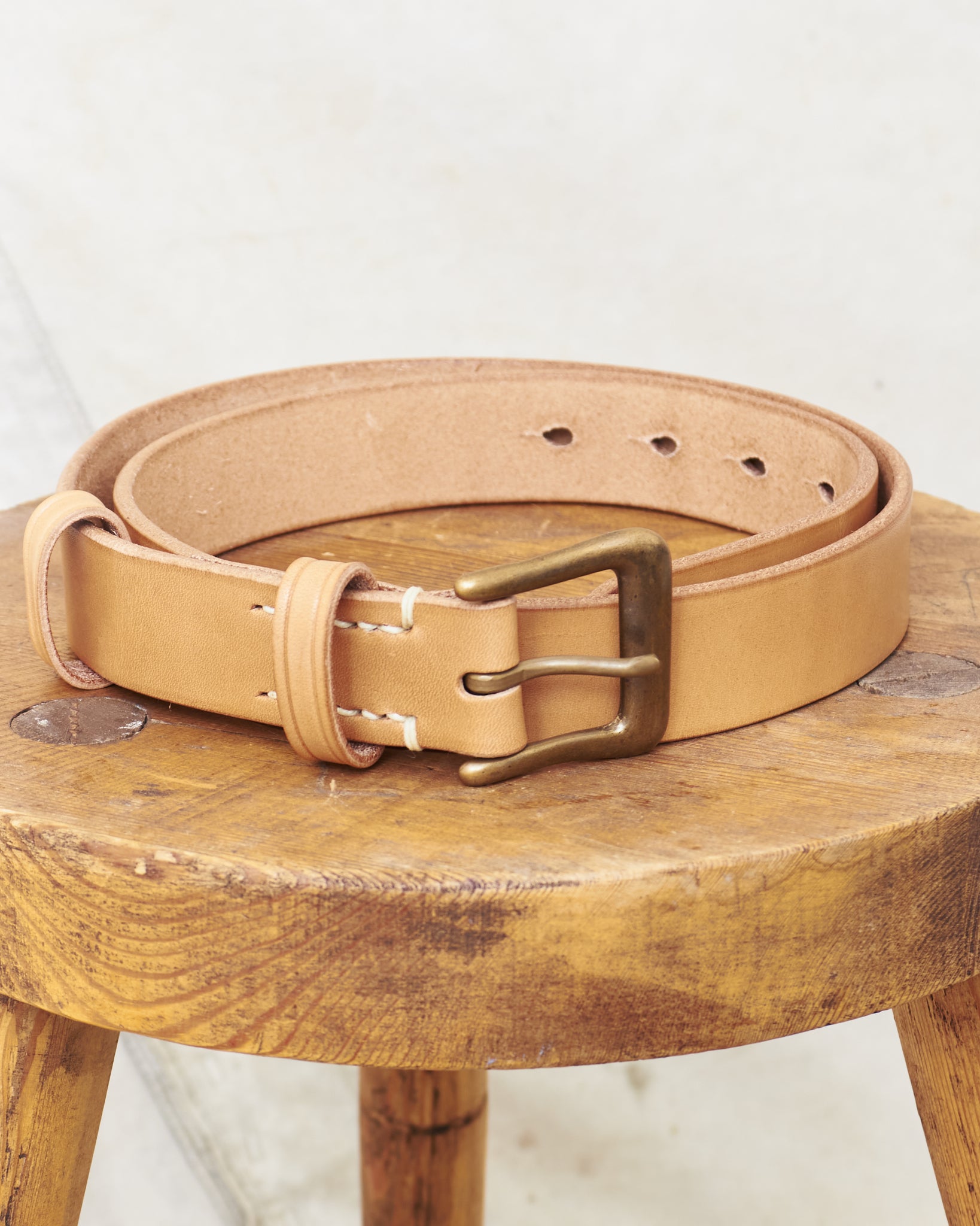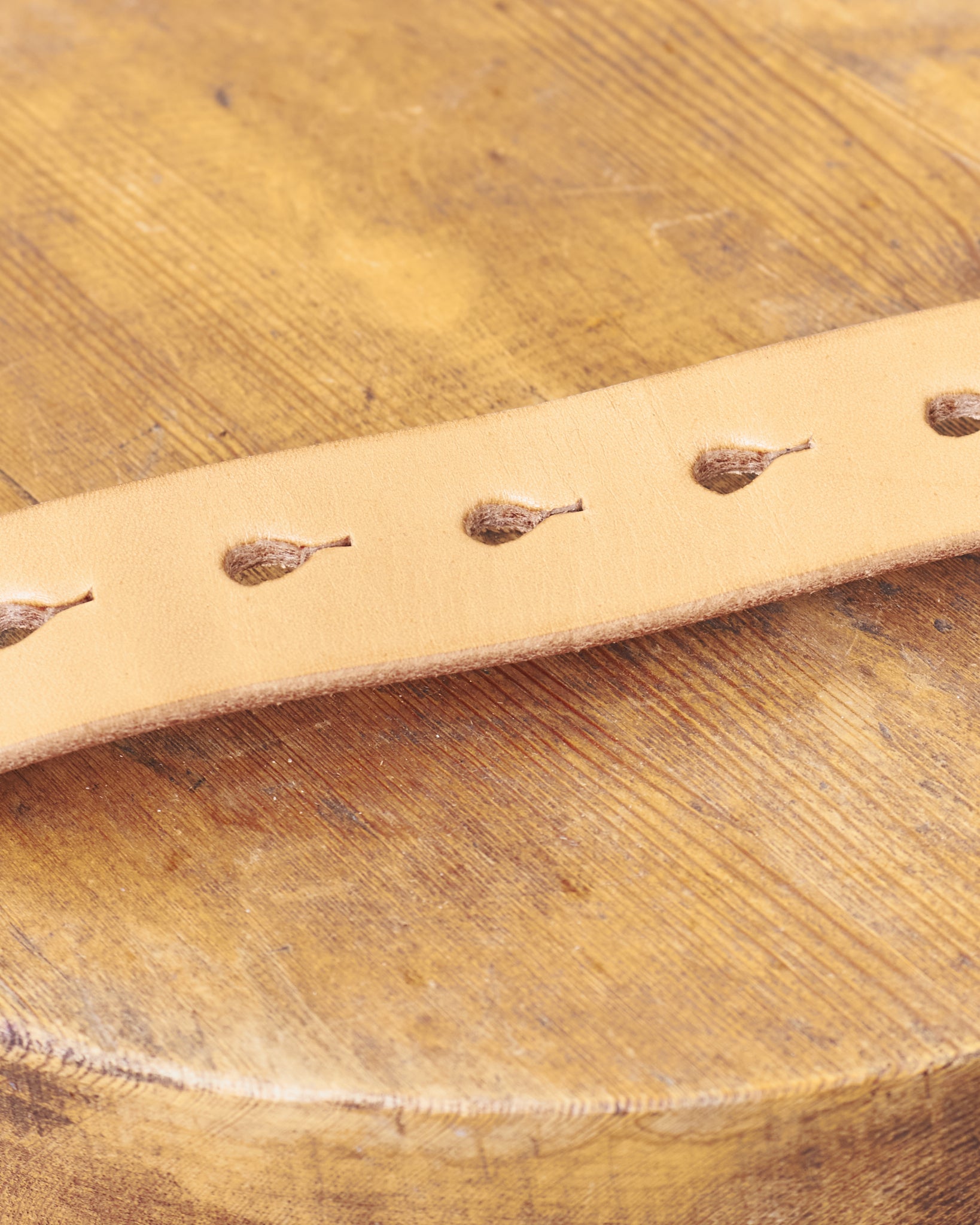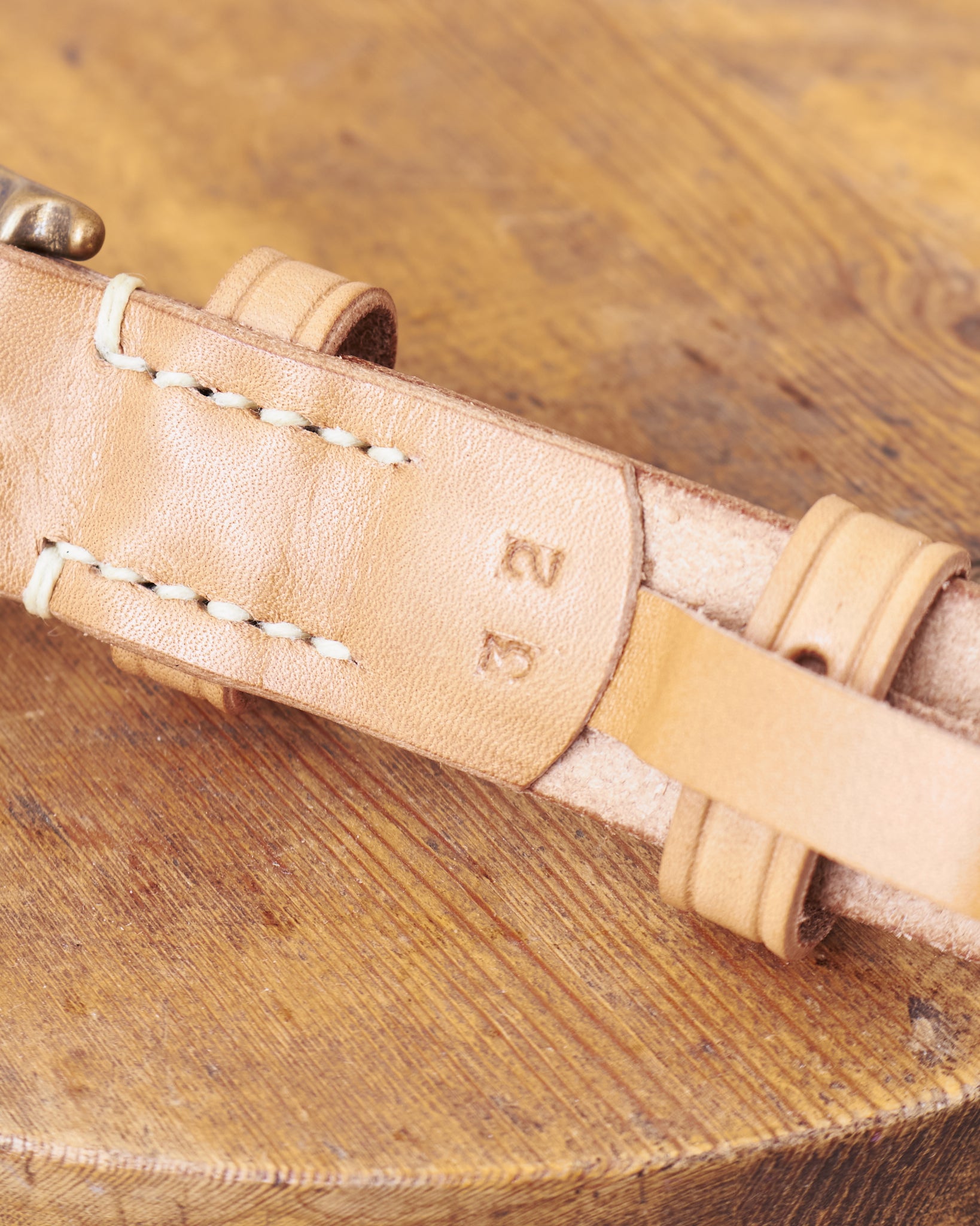 The belt is cut from a single piece of leather with a thickness of 3 mm making it strong and reliable. Our recommendation is to always go for a belt that's made of one piece of leather rather than two pieces that are stitched together, in that case the seams will break with time making the belt useless. This belt however will only get better with time and if something would break after years of use it will also be easy to repair! The leather used is undyed, meaning that with lots of wear the leather will get a most beautiful dark brown patina.