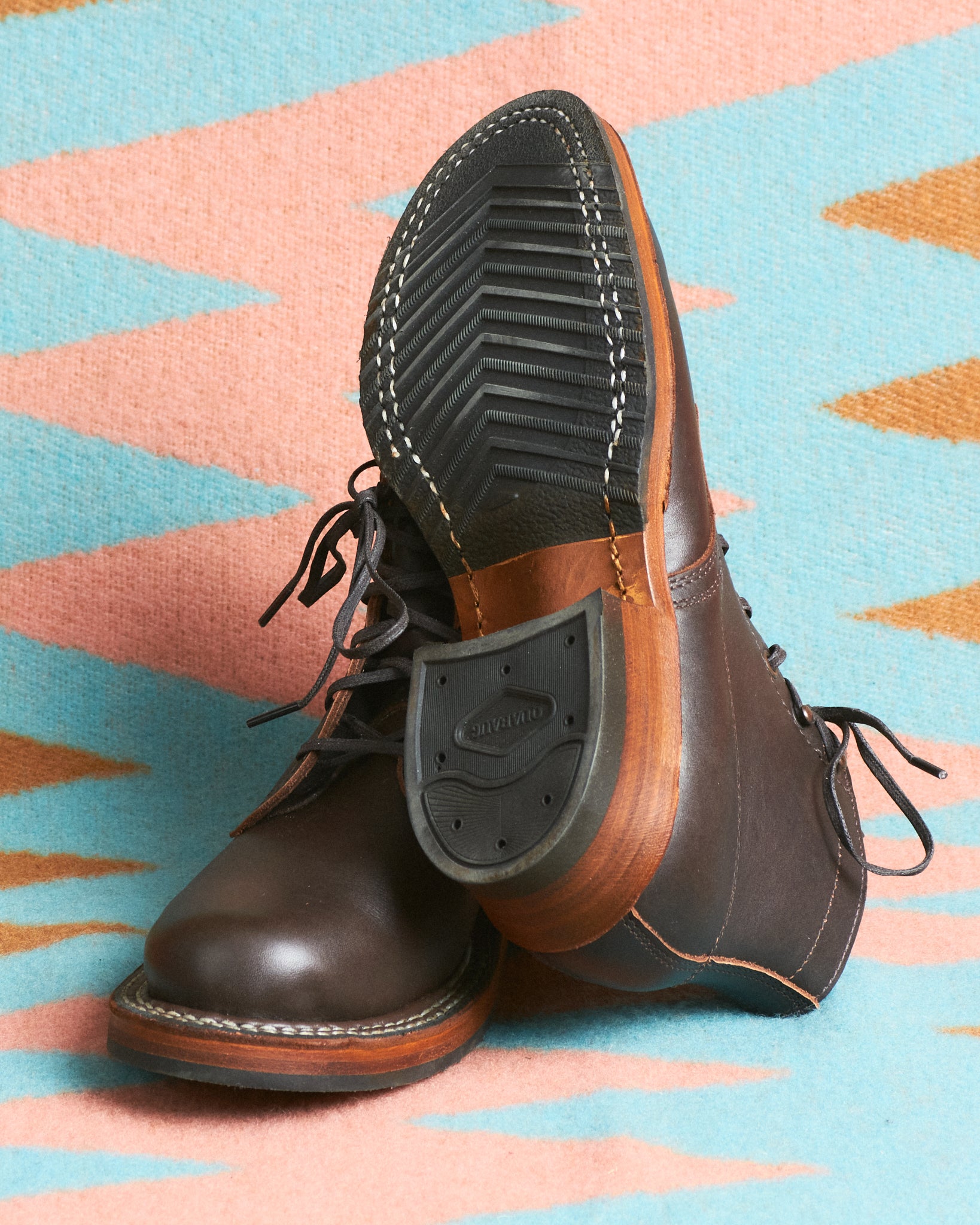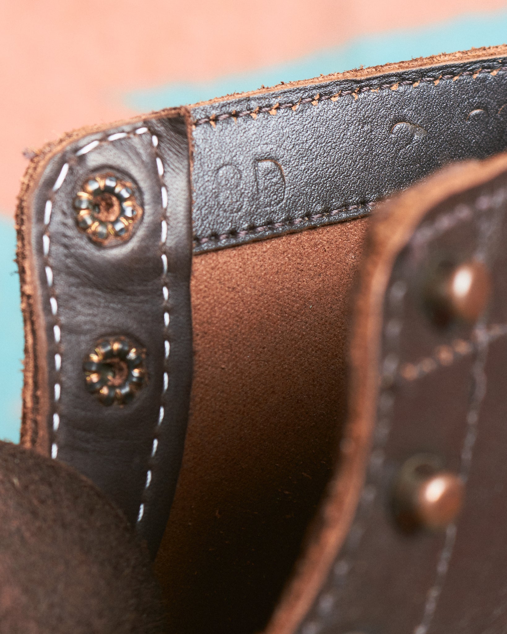 Just as in the 1930's, these boots are made without the use of synthetic materials. They are hand welted, a technique that is considered one of the finest in shoe making. For this technique the shoemakers at White's use a thick "Irish Linen" thread to welt the uppers. In addition, instead of using a steel shank, White's makes use of a stacked leather shank, creating the distinct "bellowed waist" shape on the underside of the outsole.