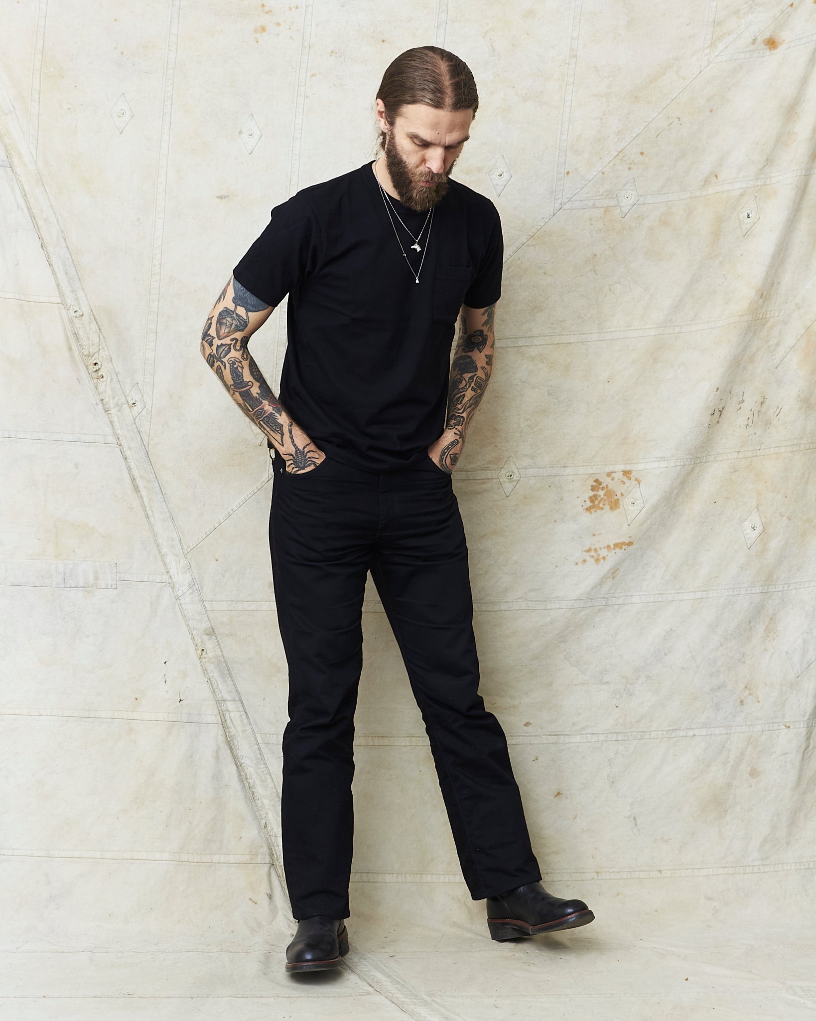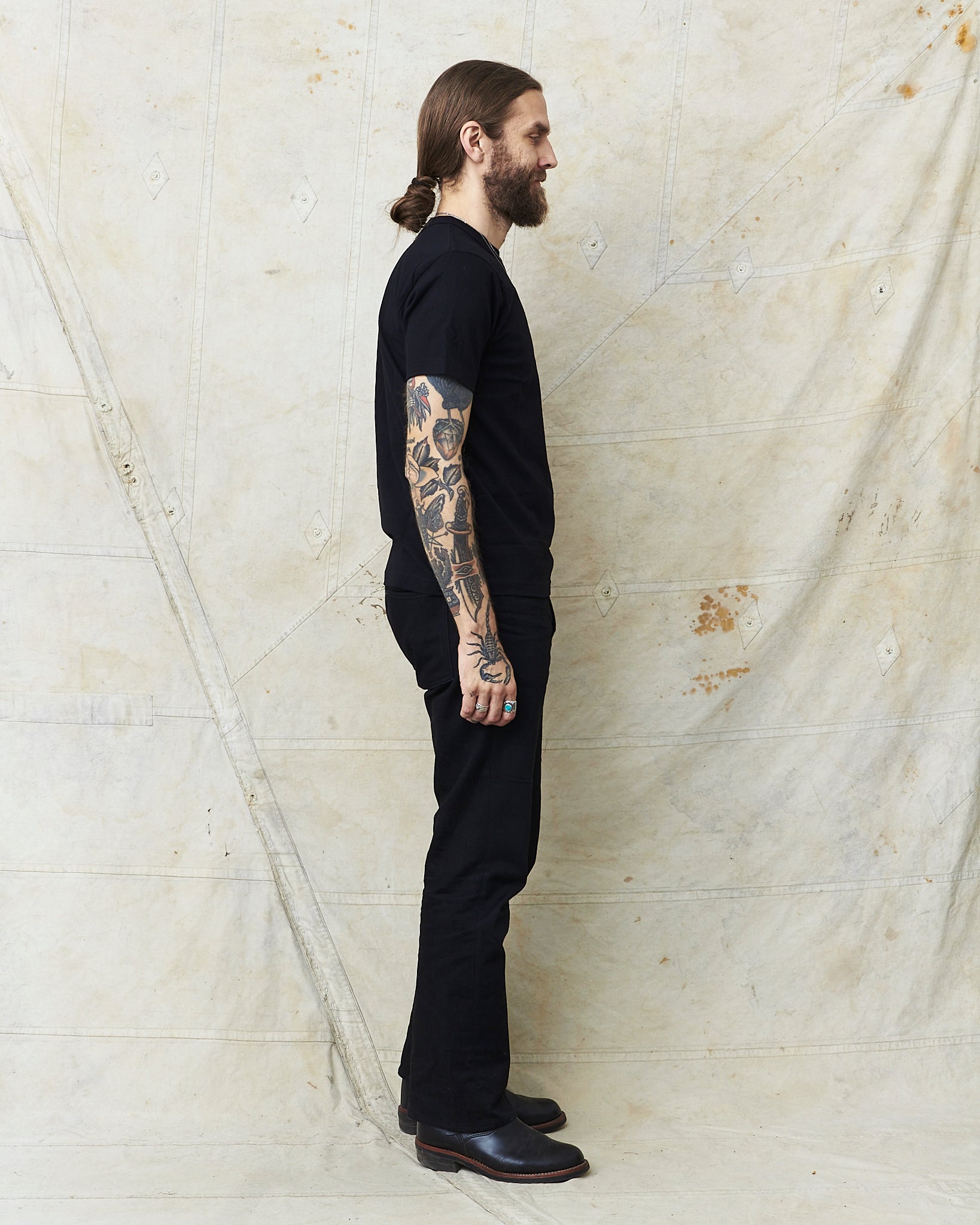 If you are looking for a perfect high quality T-shirt, Whitesville may be just what your looking for! These t-shirts are tubular knitted in Japan of thick and sturdy cotton quality that is a pleasure to wear. It's got one chest pocket and a boxy fit. All in all a magnificent t-shirt made to be worn for years.